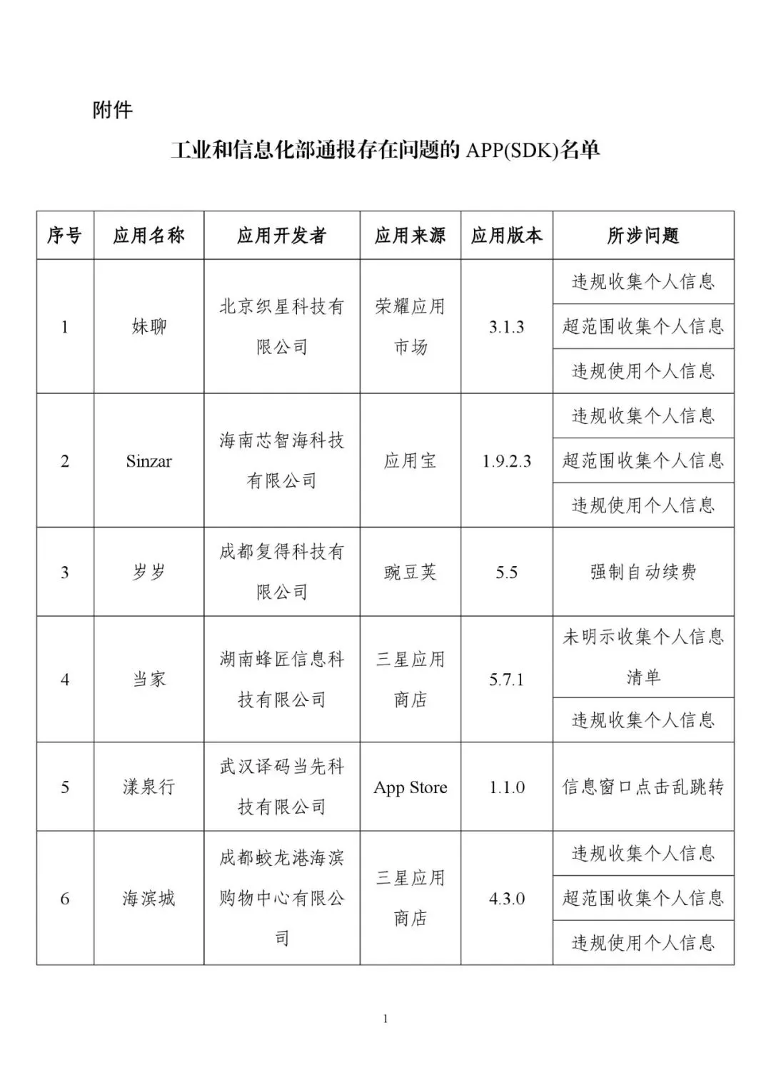 附件:工业和信息化部通报存在问题的APP(SDK)名单