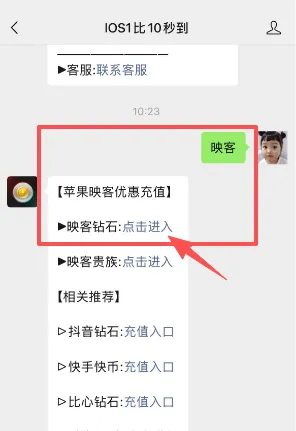 第二步、在公众号对话框中回复关键词“映客”,公众号将自动推送优惠充值入口。