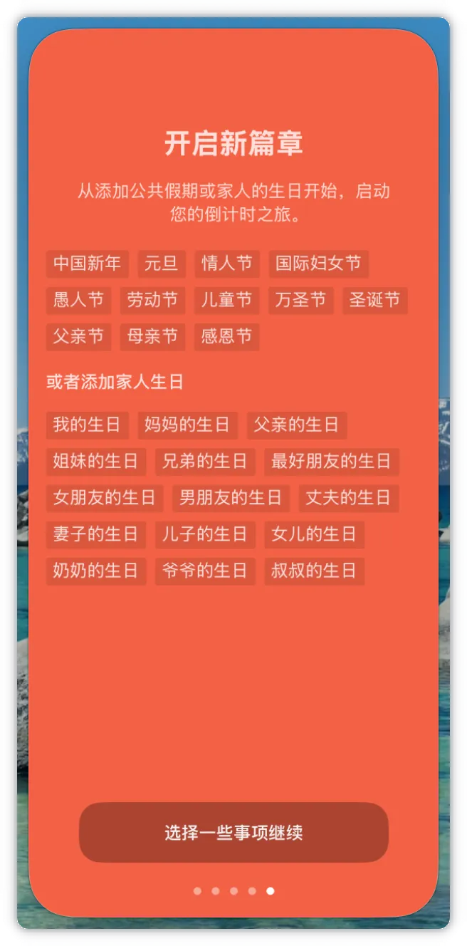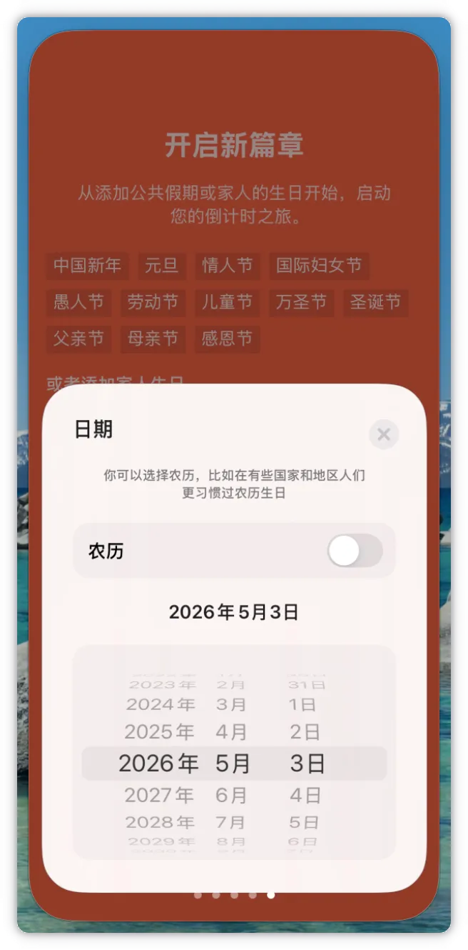 点击+就可以添加你的重要时刻了,你可以记录家人的生日,公司重要事情等其他未来值得纪念的重要时刻。阴历农历时刻都支持。