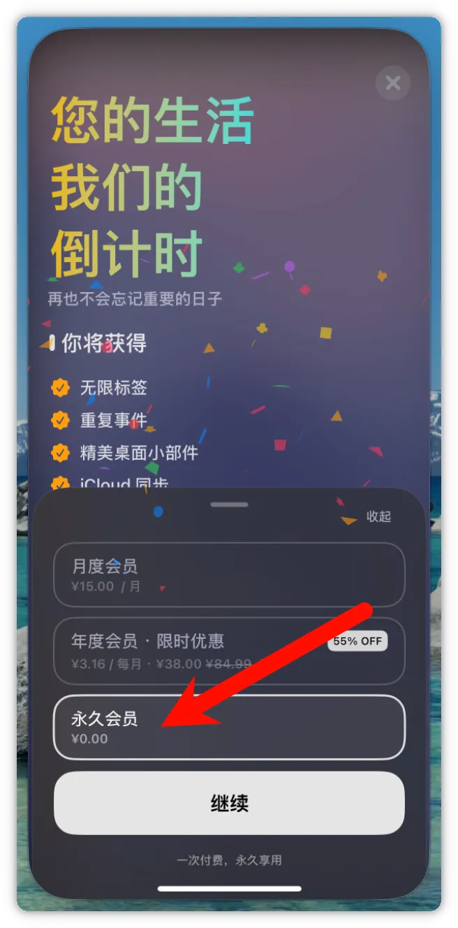 下载APP之后,根据引导页直到最后,然后就会显示永久会员¥0.00