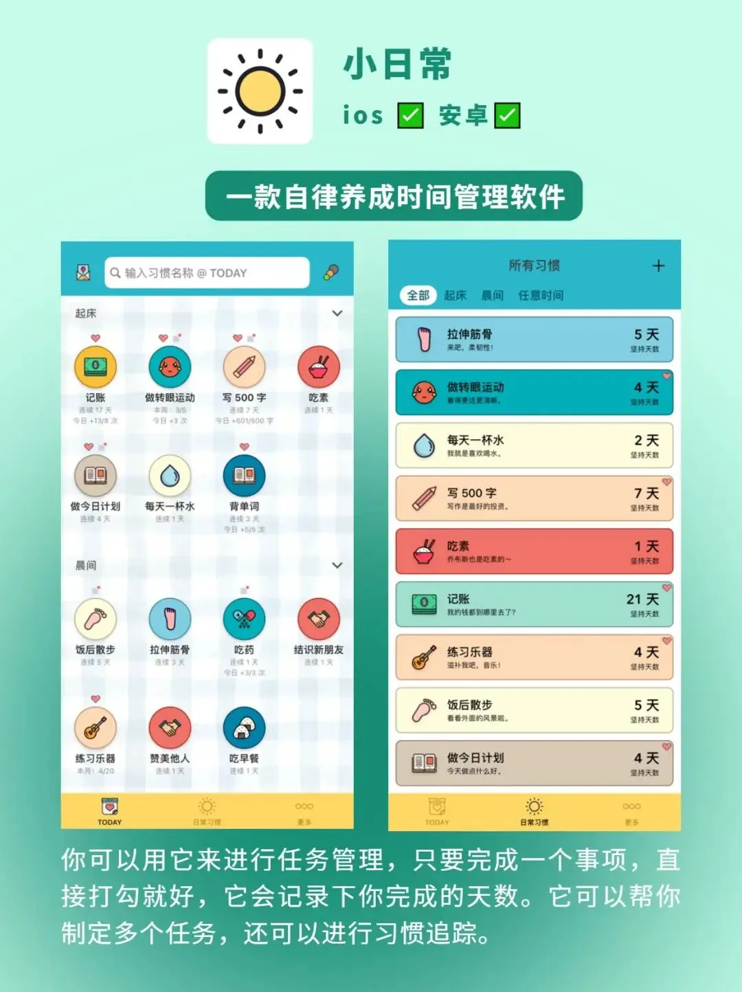 你可以用它来进行任务管理,只要完成一个事项,直接打勾就好,它会记录下你完成的天数。它可以帮你制定多个任务,还可以进行习惯追踪。