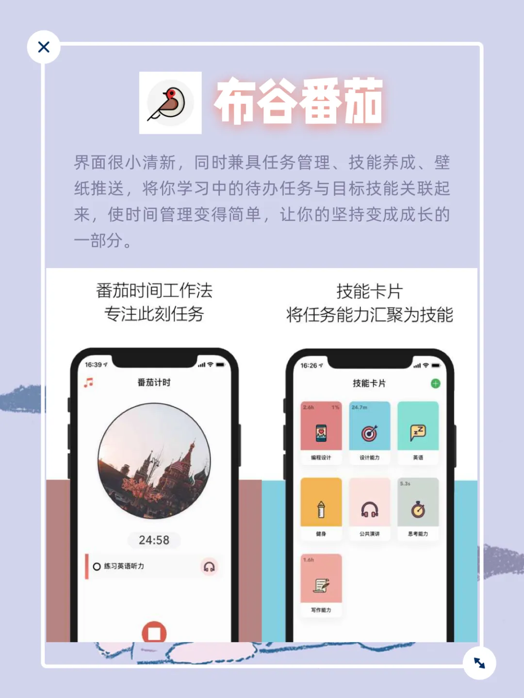 界面很小清新,同时兼具任务管理、技能养成、壁纸推送,将你学习中的待办任务与目标技能关联起来,使时间管理变得简单,让你的坚持变成成长的一部分。