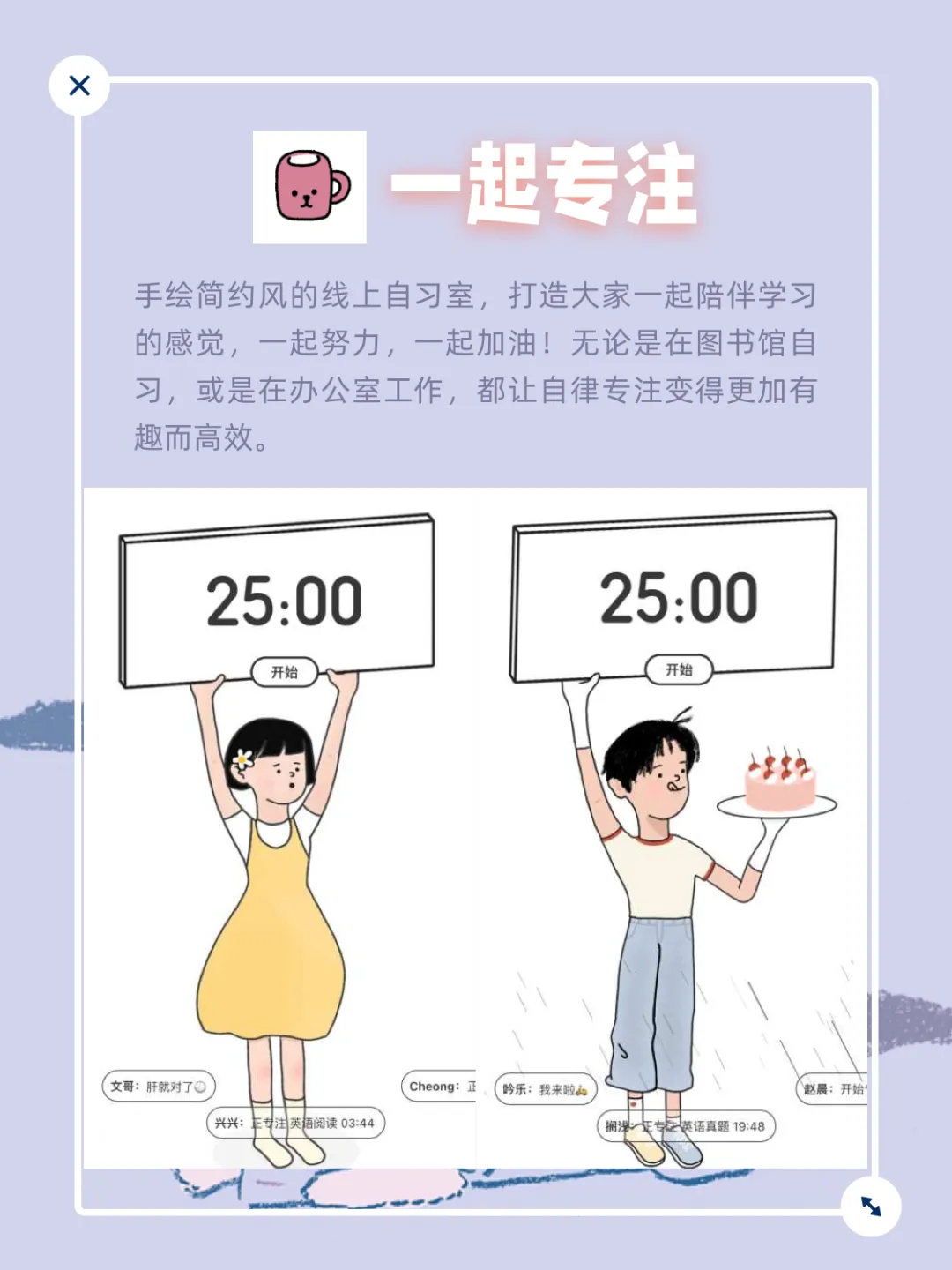 手绘简约风的线上自习室,打造大家一起陪伴学习的感觉,一起努力,一起加油!无论是在图书馆自习,或是在办公室工作,都让自律专注变得更加有趣而高效。