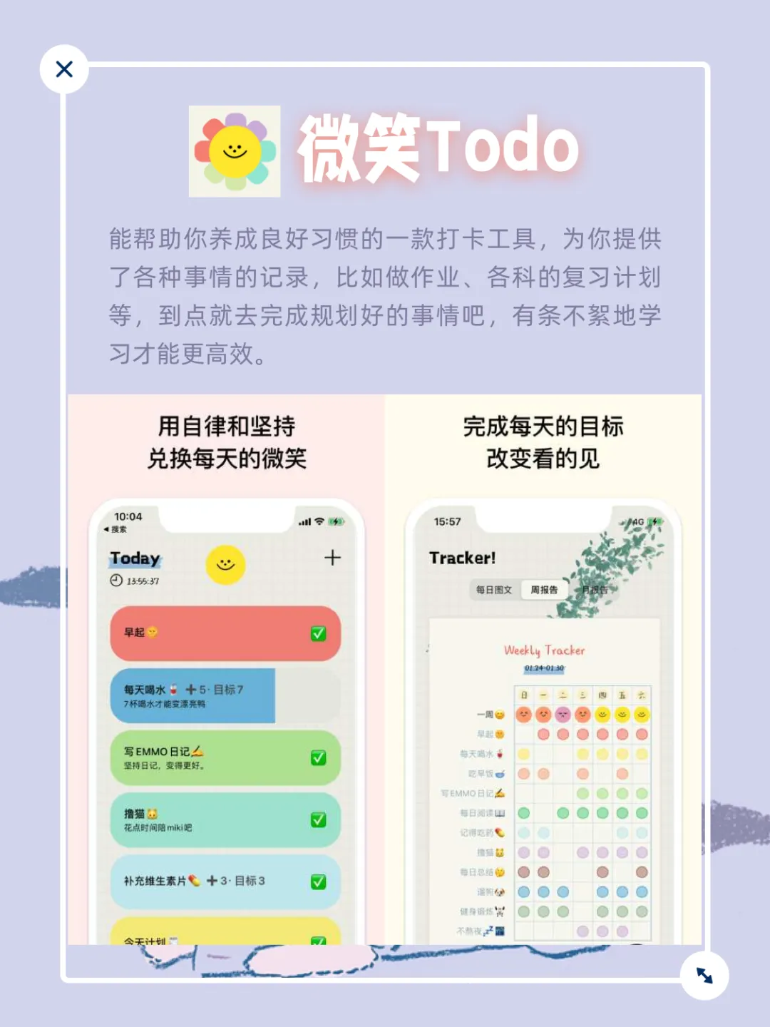 能帮助你养成良好习惯的一款打卡工具,为你提供了各种事情的记录,比如做作业、各科的复习计划等,到点就去完成规划好的事情吧,有条不絮地学习才能更高效。