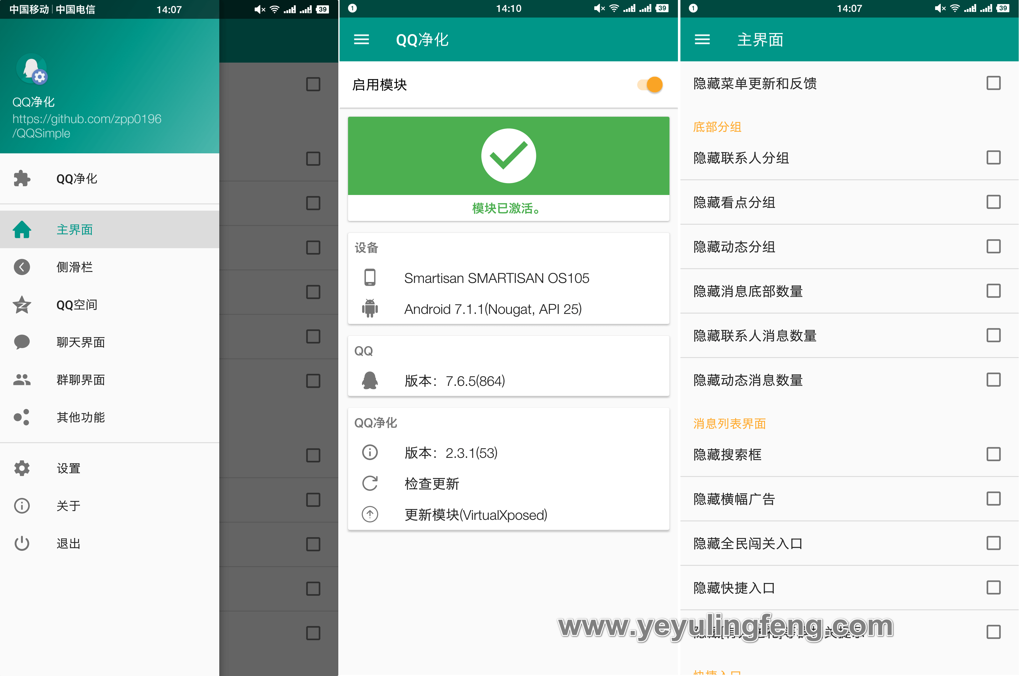 QQ目前在版本升级上非常的勤奋,除了修复了一些所谓的bug还自作主张的增加了许多用户用不上的鸡肋功能,相信不少小伙伴都感觉到QQ占用越来越高广告也越来越多了,再加上老马一直在疯狂的打击各种第三方绿化版的QQ,使得不少用户纷纷转战微信。目前老夜已经用上了办公版的QQ也就是TIM,非常的好用,也没有其他花里胡哨晃眼的功能了,但是阉割了不少功能,鱼和熊掌都要兼得怎么办呢,QQ精简模块应运而生,适用于只用QQ聊天或不想使用精简包又想去除不必要功能的人群。