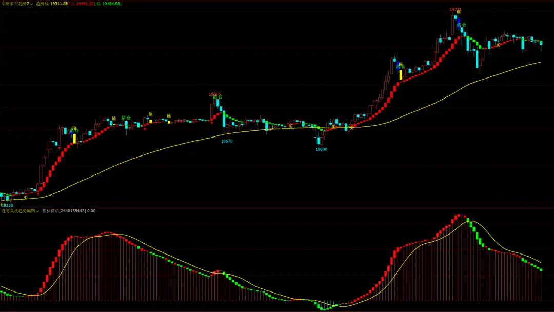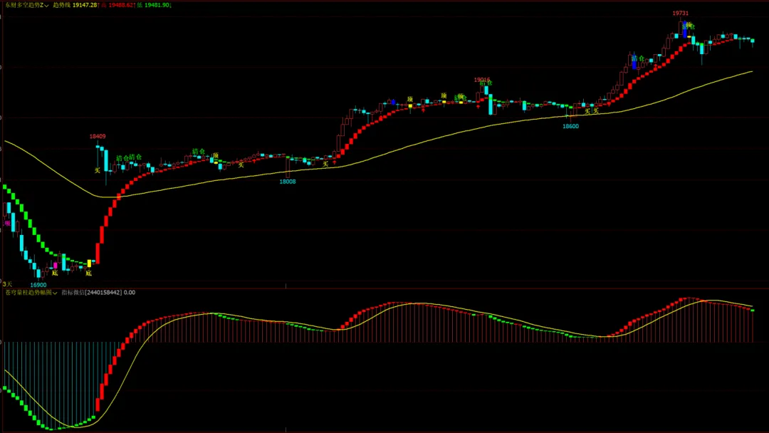 1、指标名称: 东财多空趋势+苍穹量柱趋势幅图,主图幅图无未来函数。