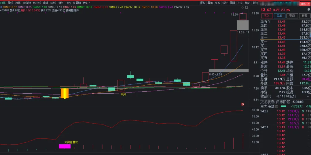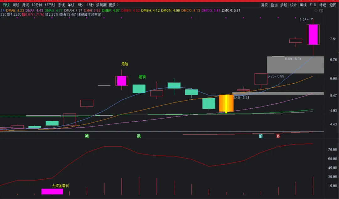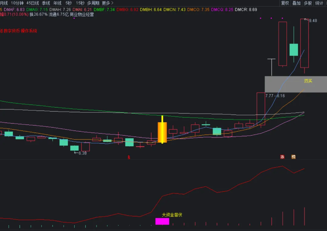 DMAA:=STRCAT(HYBLOCK,’ ‘);DMAB:=STRCAT(DMAA,DYBLOCK);DMAC:=STRCAT(DMAB,’ ‘);DRAWTEXT_FIX(ISLASTBAR,0.01,0.07,0,STRCAT(DMAC,GNBLOCK)),COLORRED;DMAD:MA(CLOSE,5);DMAE:MA(CLOSE,10);DMAF:MA(CLOSE,20);DMAG:MA(CLOSE,60);DMAH:MA(CLOSE,120);DMAI:MA(CLOSE,250);DMAJ:=REF(C,1);DMAK:=SMA(MAX(C-DMAJ,0),6,1)/SMA(ABS(C-DMAJ),6,1)*100;DMAL:=(SMA(HIGH,21,2)*1.05);DMAM:=HHV(EMA(((((OPEN+LOW)+HIGH)+CLOSE)/4),5),60);DMAN:=REF(CLOSE,1);DMAO:=((SMA(MAX((CLOSE-DMAN),0),7,1)/SMA(ABS((CLOSE-DMAN)),7,1))*100);DMAP:=CROSS(79,DMAO);DMAQ:=FILTER(DMAP,4);DMAR:=(((HHV(HIGH,36)-CLOSE)/(HHV(HIGH,36)-LLV(LOW,36)))*100);DMAS:=SMA(DMAR,5,1);DMAT:=SMA(DMAS,8,1);DMAU:=(CROSS(DMAS,DMAT) AND (DMAT<16));DMAV:=((CLOSE>(LLV(CLOSE,60)+(0.3*LLV(CLOSE,60)))) AND DMAU);DMAW:=IF((CLOSE>1000),DMAU,DMAV);DMAX:=DMAW;DMAY:=(HIGH+LOW+OPEN+2*CLOSE)/5;DMAZ:=REF(DMAY,1);DMBA:=SMA(MAX(DMAY-DMAZ,0),10,1)/SMA(ABS(DMAY-DMAZ),10,1)*100;DMBB:=IF(COUNT(DMBA<20,5)>=1 AND COUNT(DMAY=LLV(DMAY,10),10)>=1 AND CLOSE>=OPEN*1.038 AND VOL>MA(VOL,5)*1.2,1,0);DRAWTEXT(DMBB,LOW*0.99,’ ↖注意买入’),COLORYELLOW;DMBC:=(SMA(HIGH,21,2)*1.05);STICKLINE(((((C/O)>1.04) AND (C<DMBC)) AND ((C-REF(C,1))>0)),C,O,3.3,0),COLOR0077FF;STICKLINE(((((C/O)>1.04) AND (C<DMBC)) AND ((C-REF(C,1))>0)),C,O,2.8,0),COLOR0099FF;STICKLINE(((((C/O)>1.04) AND (C<DMBC)) AND ((C-REF(C,1))>0)),C,O,2.1,0),COLOR00AAFF;STICKLINE(((((C/O)>1.04) AND (C<DMBC)) AND ((C-REF(C,1))>0)),C,O,1.3,0),COLOR00CCFF;STICKLINE(((((C/O)>1.04) AND (C<DMBC)) AND ((C-REF(C,1))>0)),H,L,0.4,0),COLOR00FFFF;DMBD:=C,NODRAW;DMBE:=5;DMBF:COST(15*DMBE),COLORGREEN,DOTLINE,NODRAW;DMBG:COST(6*DMBE),COLORRED,DOTLINE,NODRAW;DMBH:COST(1*DMBE),COLORYELLOW,NODRAW;DRAWTEXT_FIX(1,0,0.95,0,’公众号:江湖指标客’),COLORMAGENTA;DRAWTEXT(CROSS(DMBD,DMBF) AND CROSS(DMBD,DMBG),LOW*0.98,’双买’),COLORYELLOW;DMBI:=((CLOSE-MA(CLOSE,6))/MA(CLOSE,6)*100+(CLOSE-MA(CLOSE,24))/MA(CLOSE,24)*100+(CLOSE-MA(CLOSE,32))/MA(CLOSE,32)*100)/3;DMBJ:=DMBI>20 AND FILTER(DMBI<REF(DMBI,1),5);DMBK:=DMBI>9 AND FILTER(DMBI<REF(DMBI,1),5);DMBL:=HHV(DMBI>20,10);DMBM:=DMBL AND CROSS((REF(HIGH,1)+REF(LOW,1))/2,MA(CLOSE,20)+2*STD(CLOSE,20));DRAWTEXT(DMBI>9 AND FILTER(DMBI<REF(DMBI,1),5),H*1.04,’短顶’),COLOR00FF00;DRAWTEXT(DMBI>20 AND FILTER(DMBI<REF(DMBI,1),5),H*1.07,’大顶’),COLORWHITE;DRAWTEXT(DMBM,H*1.03,’危险’),COLORYELLOW;DMBN:=((MA(C,30)-L)/MA(C,60))*200;DMBO:=REF(CLOSE,1);DMBP:=SMA(MAX(CLOSE-DMBO,0),7,1)/SMA(ABS(CLOSE-DMBO),7,1)*100;DMBQ:=FILTER(REF(DMBP,1)<20 AND DMBP>REF(DMBP,1),5);DMBR:=C/MA(C,40)<0.74;DMBS:=5;DMBT:=EMA(C,DMBS);DMBU:=EMA(DMBT,DMBS);DMBV:=DMBT-REF(DMBT,1);DMBW:=DMBU-REF(DMBU,1);DMBX:=ABS(DMBT-DMBU);DMBY:=(H-L)/REF(C,1)>0.05;DMBZ:=(DMBV+DMBW)/2;DMCA:=POW(DMBX,1)*POW(DMBZ,3);DMCB:=DMCA/HHV(ABS(DMCA),DMBS*3);DMCC:=COUNT(DMBY,5)>1;DMCD:=DMBR AND DMBY AND DMCC;DMCE:=CROSS(DMCB,-0.9);DMCF:=FILTER((DMBQ AND DMBN>20 OR C>REF(C,1)) AND REF(DMCD,1),10);DMCG:=FILTER(REF(DMCD,1) AND (DMCE OR C>REF(C,1)) AND “MACD.MACD”>-1.5,10);DMCH:=COUNT(DMCG,13)>=1 AND DMCF;DMCI:=EXIST(DMCH,13) AND C<O;DRAWTEXT(DMCH>0.1,L*0.95,’ 智尊擒底’),COLORYELLOW;DRAWICON(DMCH>0.1,L*0.98,34),COLORRED;DRAWTEXT(FILTER(DMCI,13),L*0.97,’可能变盘’),COLORRED;DRAWICON(FILTER(DMCI,13),H*1.01,39),COLORRED;DMCJ:=ABS(((3.48*CLOSE+HIGH+LOW)/4-EMA(CLOSE,20))/EMA(CLOSE,20));DMCK:=DMA(((2.15*CLOSE+LOW+HIGH)/4),DMCJ);DMCL:=EMA(DMCK,200)*1.118;DMCM:=(DMCL+MA(C,60)*1.075)/1.75*1.05,LINETHICK2,COLORCYAN;DMCN:BOLL+2*STD(CLOSE,20)DOTLINE,COLORYELLOW,NODRAW;DMCO:(MA(CLOSE,2)+MA(CLOSE,3))/2,COLOR0077FF,NODRAW;DMCP:=BOLL+2*STD(CLOSE,20)*0.4,COLORRED,NODRAW;DMCQ:(DMCP*0.45+DMCM*0.55),DOTLINE,COLORMAGENTA,NODRAW;DMCR:(DMCM+DMCQ)/2*0.995,DOTLINE,COLORWHITE,NODRAW;STICKLINE(O>DMCR AND C>DMCM AND DMCN>L AND DMCN<C AND DMCO>L AND DMCO<C,O,C,2,0),COLORMAGENTA;