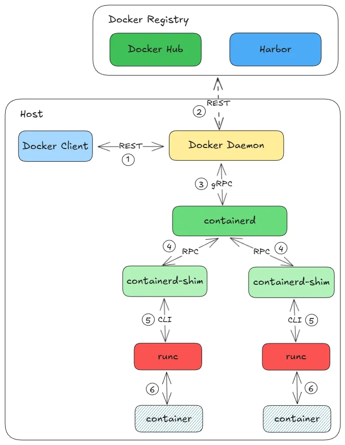 2016 年是 Docker 架构演进的关键年份。Docker 将 containerd 从核心引擎中分离出来,成为一个独立的守护进程,专门负责容器的生命周期管理。containerd 的分离使得 Docker 架构从单一软件演变为相互独立的组件体系:Docker Daemon → containerd → runC。这种分层解耦的架构使得 Docker 更加健壮、灵活和标准化。