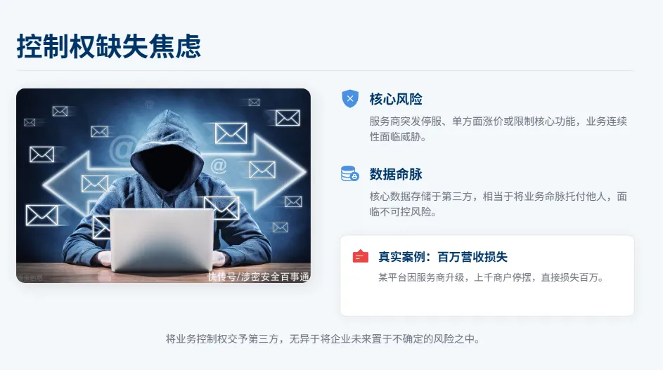 更要命的是,客户信息、交易记录这些关键数据都存在别人的服务器上,相当于把饭碗递到别人手里。