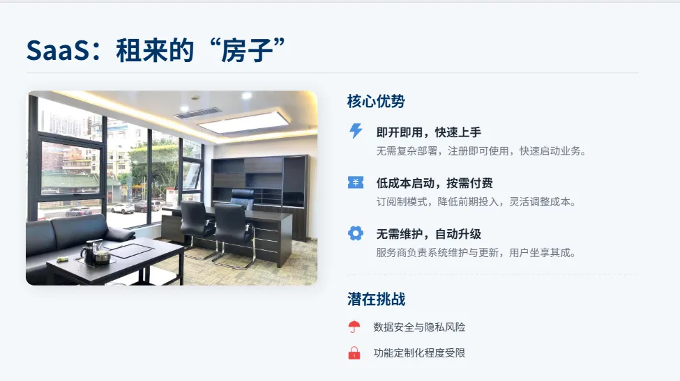 SaaS就像租房子,能临时住(快速启动生意),但不能随便装修(改功能)、不能扩建(拓业务),还可能遇到房东涨价、赶人(服务商涨价、停服);