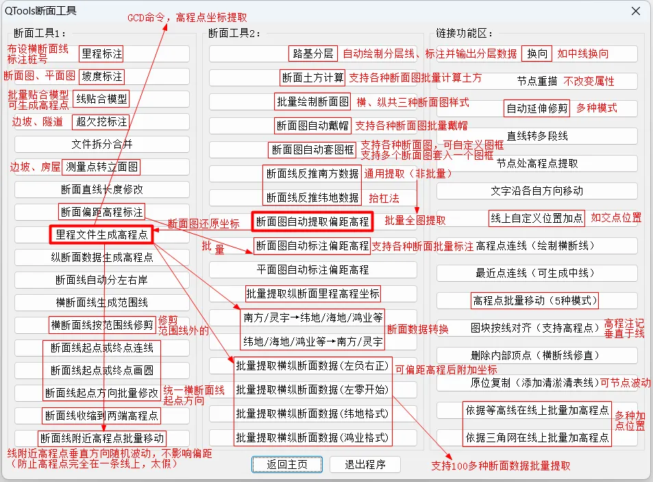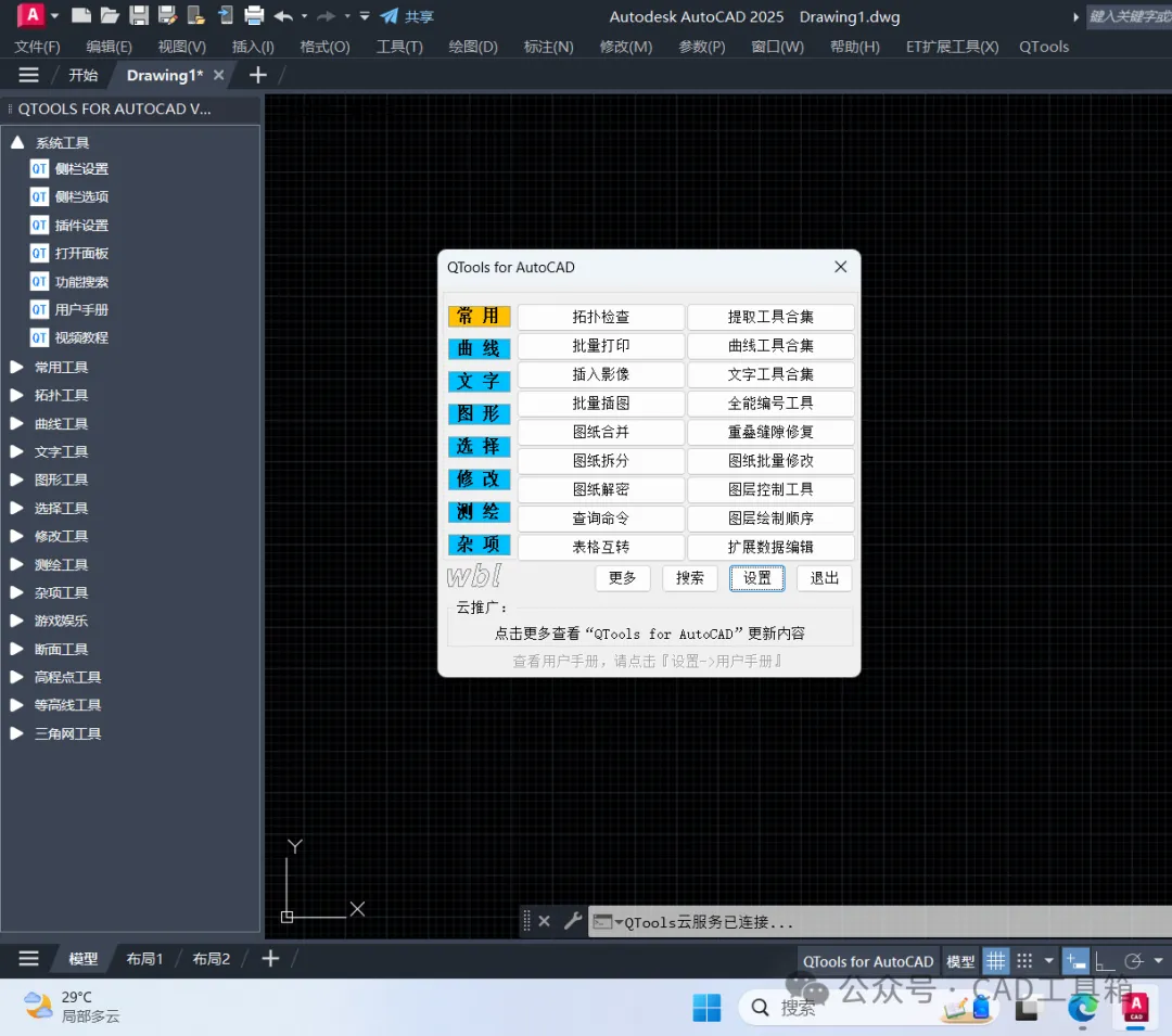 插件下载方法:关注公众号→回复关键词“下载”插件简介:“QTools for AutoCAD”是一款CAD/CASS辅助工具,功能主要涉及测绘、设计行业,含断面工具、高程点工具、等高线工具、三角网工具、曲线工具、文字工具、编号工具、提取工具、拓扑检查、缝隙修复、路基分层、自动套图框等400多个实用功能;插件全面支持AutoCAD全系列(AutoCAD2004~2027)、中望CAD2026及以上版本,完美兼容南方CASS、纬地、鸿业、天正、飞时达等主流行业软件;支持自定义快捷键、菜单栏、侧边栏、自动更新。
