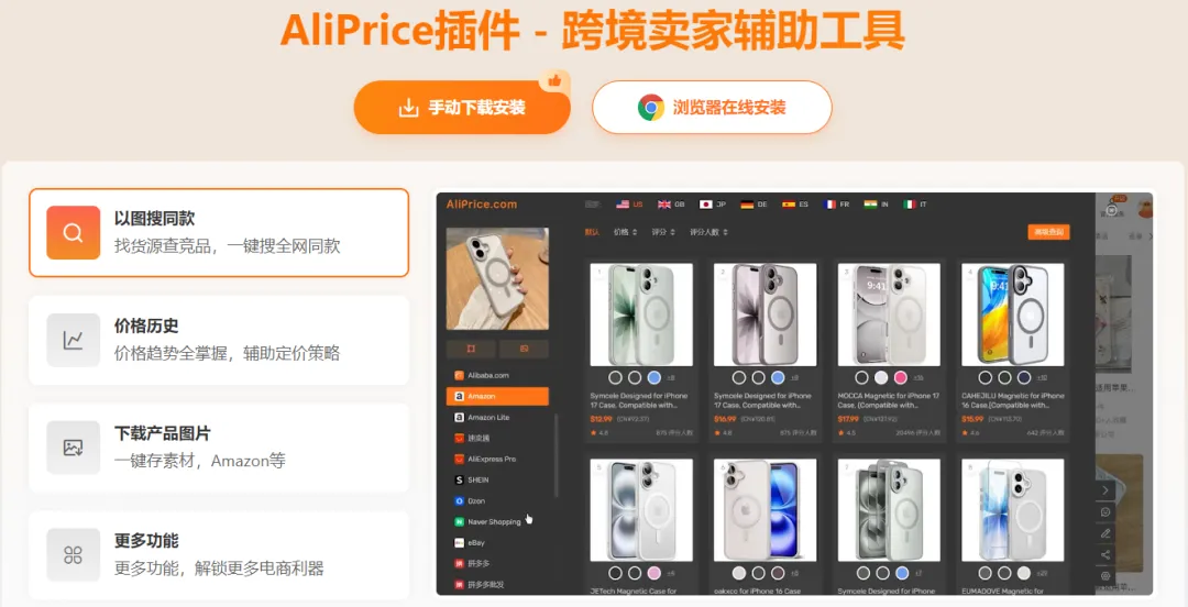 这个插件的主要作用是找货源,用一张产品图就可以在多个采购平台上找到供货商,还可以对比价格,还有一个比较重要的功能是可以下载图片素材,支持大多数的主流跨境电商平台。