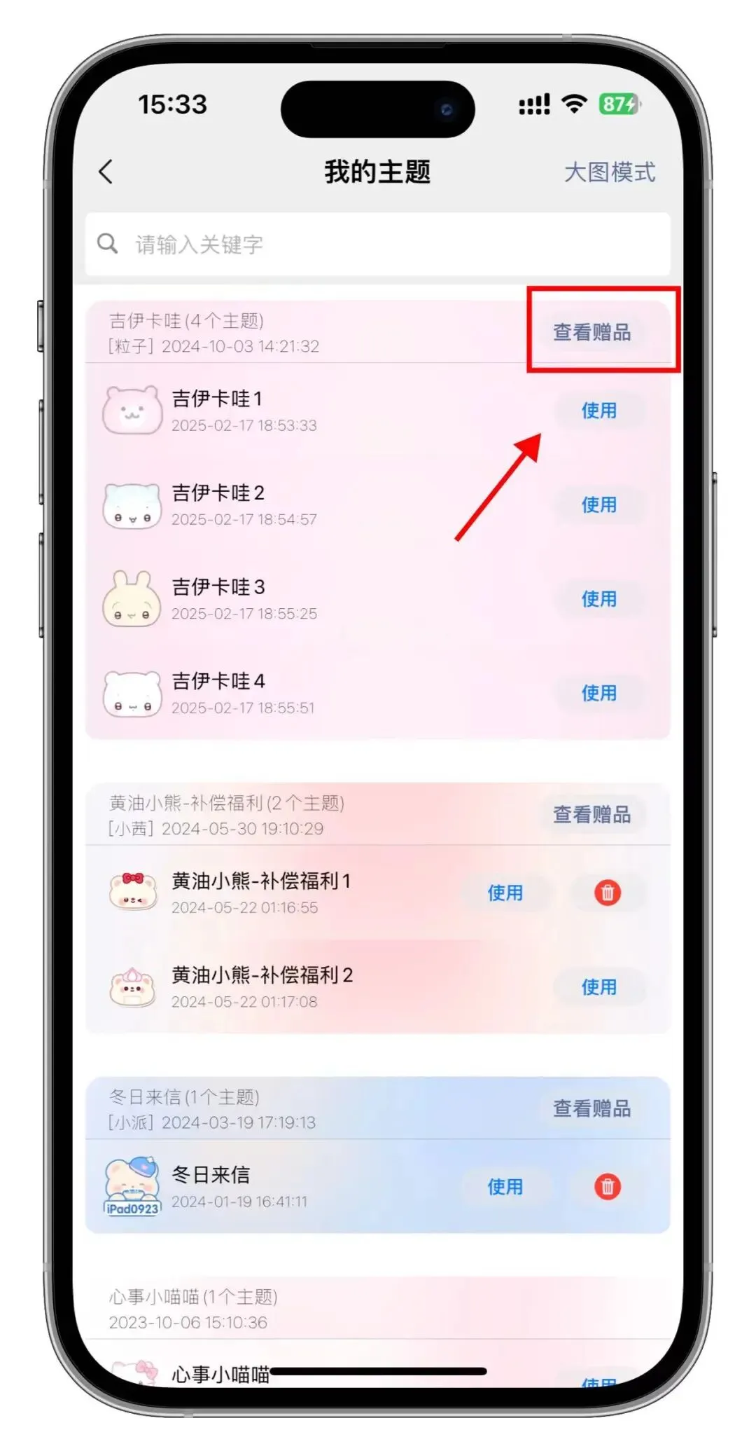 2、猪咪主题兑换后下载中心查看赠品,打开后就是赠送的键盘皮肤,如果没有内容,联系主题客服会有领取方法,每个店不一样,注意看领取要求