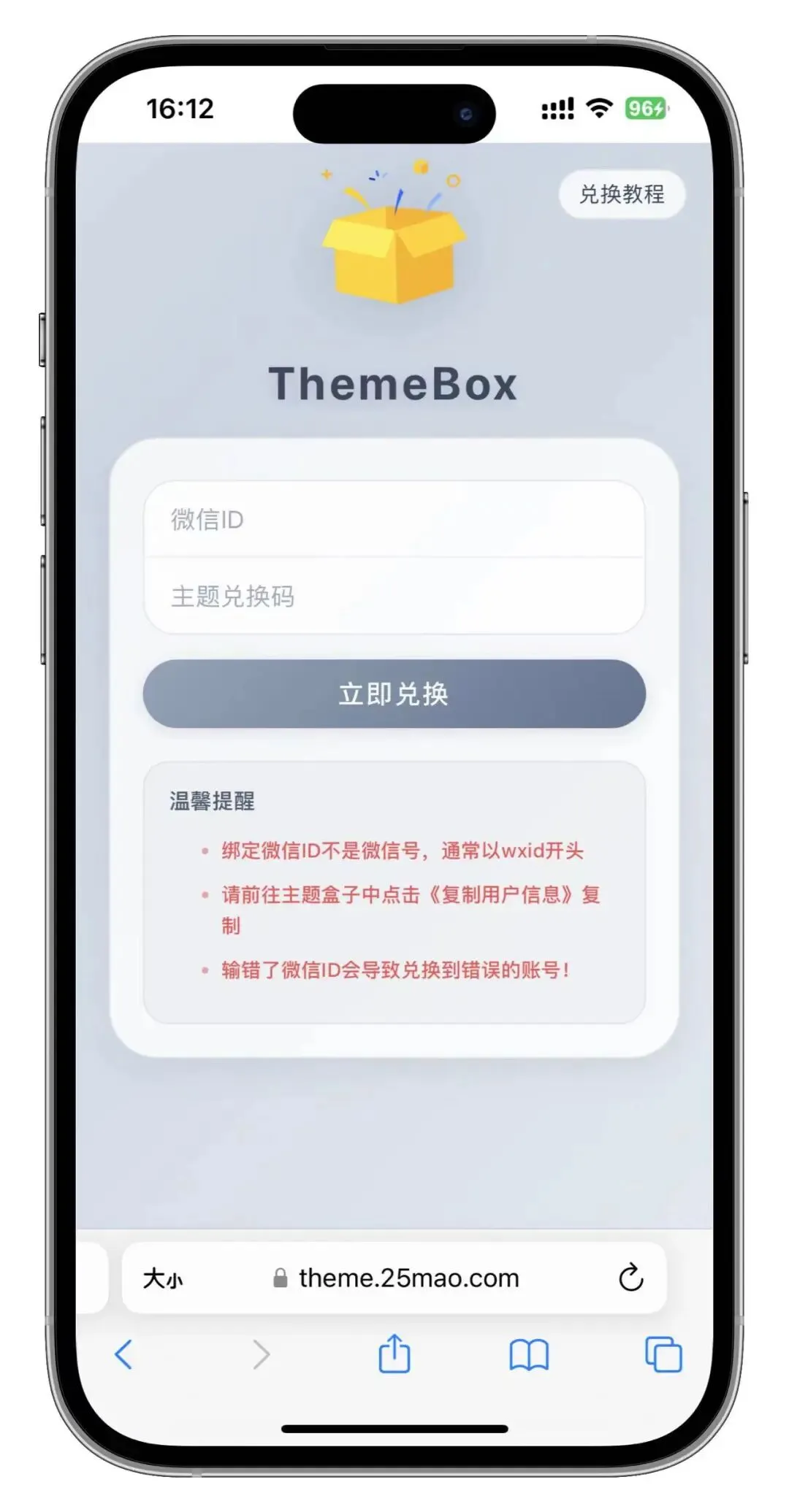 1、复制兑换网站到苹果自带浏览器Safari打开,输入兑换码(兑换码就是卡券码),输入使用主题的微信号,这里一定要注意,不能输错,不然主题到不了你的账号下面