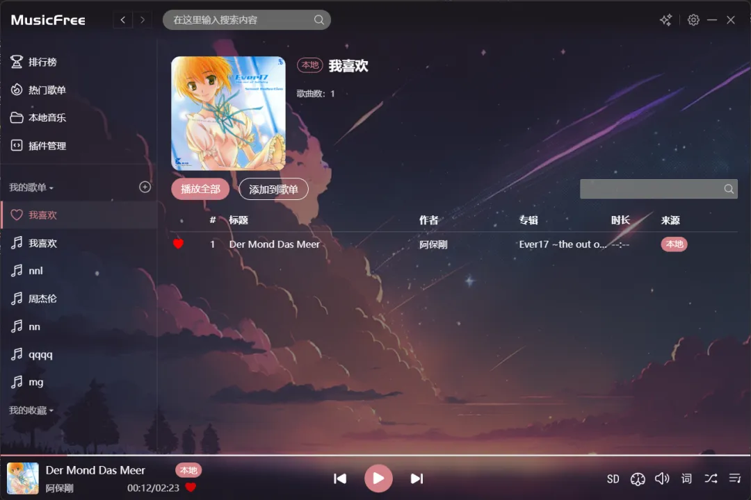 插件安装好后,就可以像普通播放器一样搜索音乐、播放歌单、导入本地音乐了。