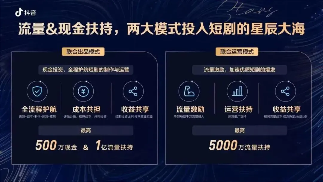 具体来看,“辰星计划”共有两种模式。一是联合出品,抖音能够提供最高500万元的现金投资,并全程护航短剧的制作与运营,包括最高1亿的流量扶持;二是联合运营,抖音主要提供最高5000万的流量激励,以加速优质短剧的爆发。