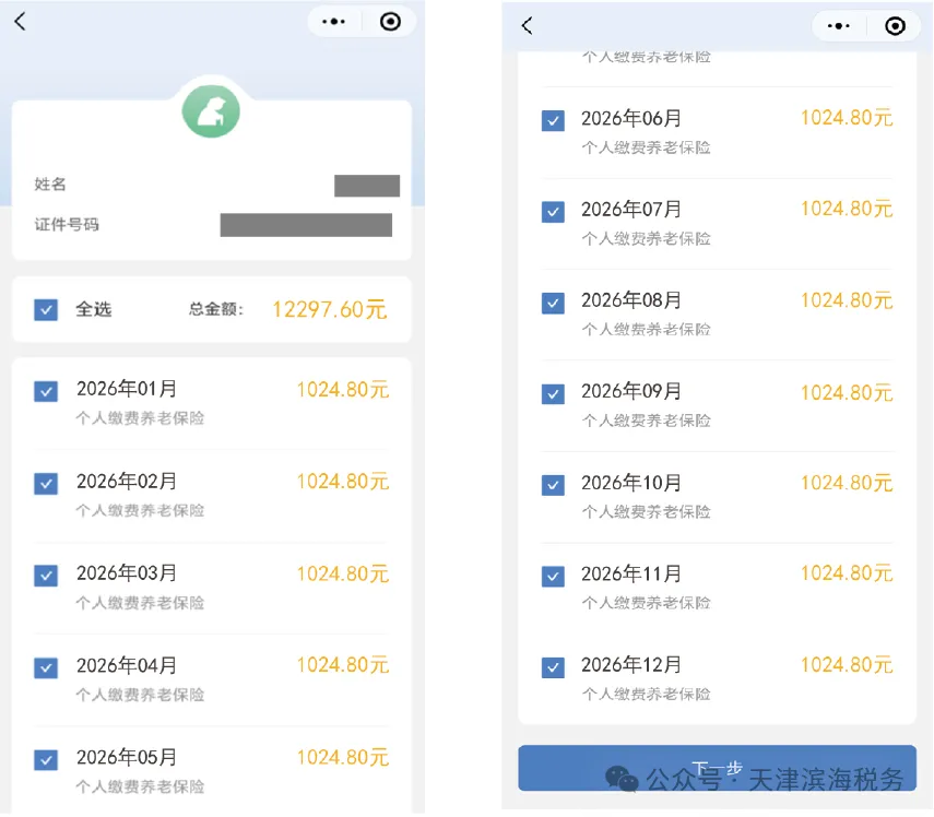 1.输入“身份证件号码”、“姓名”,选择“缴费截止年月”,点击“下一步”;确认基础信息、缴费月份是否准确,确认无误后,点击“下一步”。