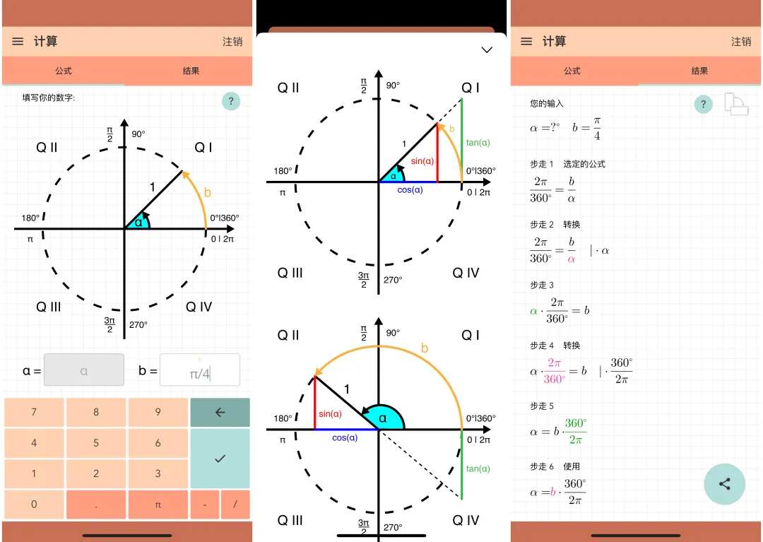 这款工具能通过超直观的计算步骤、图表和动画帮你搞懂单位圆!不管输入的是弧度、角度α,不管是负值、小数、分数还是π都能支持,计算结果会一步步清晰展示,还会以π值形式呈现,连正弦、余弦的图示和角度α的动画都能看到,单位圆的重要量也全包含~ 输入时用特殊键盘就行,点右下角复选标记就能启动计算,数值缺漏会标橙色、错误标红色,特别好分辨。而且所有结果都会存进历史记录,条目能删除、排序,选中还能自动载入重新计算,想清空全部历史也只要一键操作,解决方案也能直接分享,关键是全程无广告,用着超清爽!