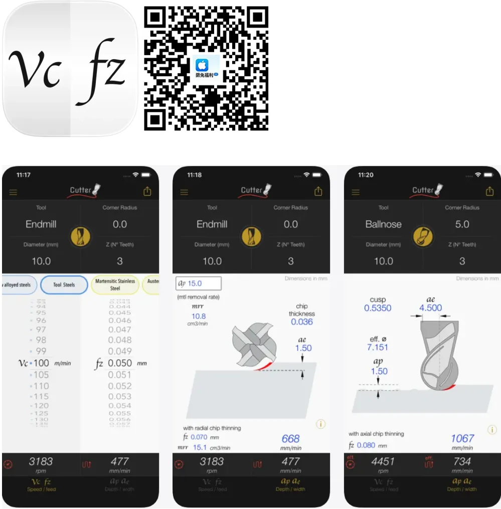 简介:一款服务于机械加工场景的工具,用于计算立铣刀、球头铣刀的切削速度与进给量,支持公制、美制双单位;能依据刀具参数和加工材料组生成基准切削参数,同时涵盖材料去除率、球头铣刀专属参数计算等专业功能,还可调整切削尺寸、设置最大转速、分享切削数据,建议结合刀具供应商的推荐数据使用,核心是辅助加工人员快速获取合理的切削工艺参数。