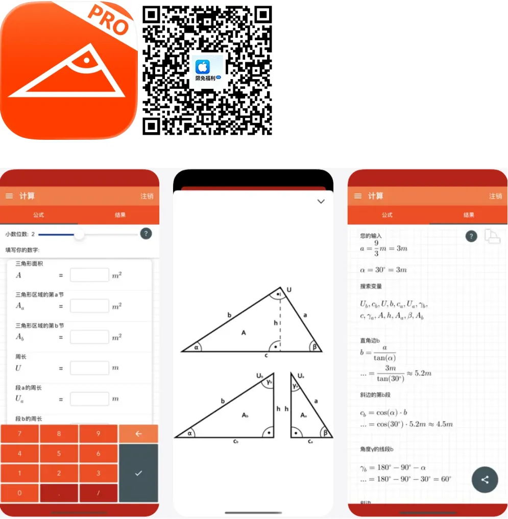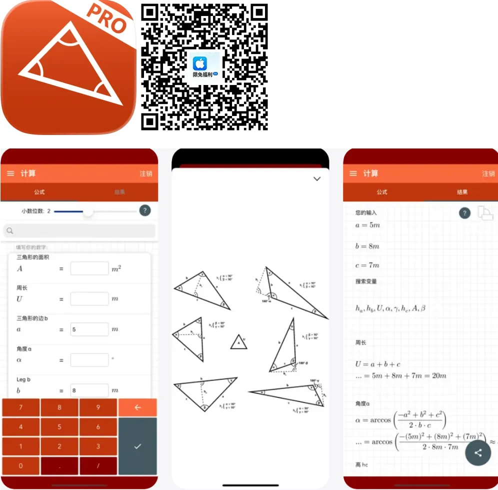 简介:计算任意三角形的所有数量的最佳应用。你必须输入一些数量,如两个角和一个长度。该算法搜索所缺数量的公式,显示它们并计算出结果。
