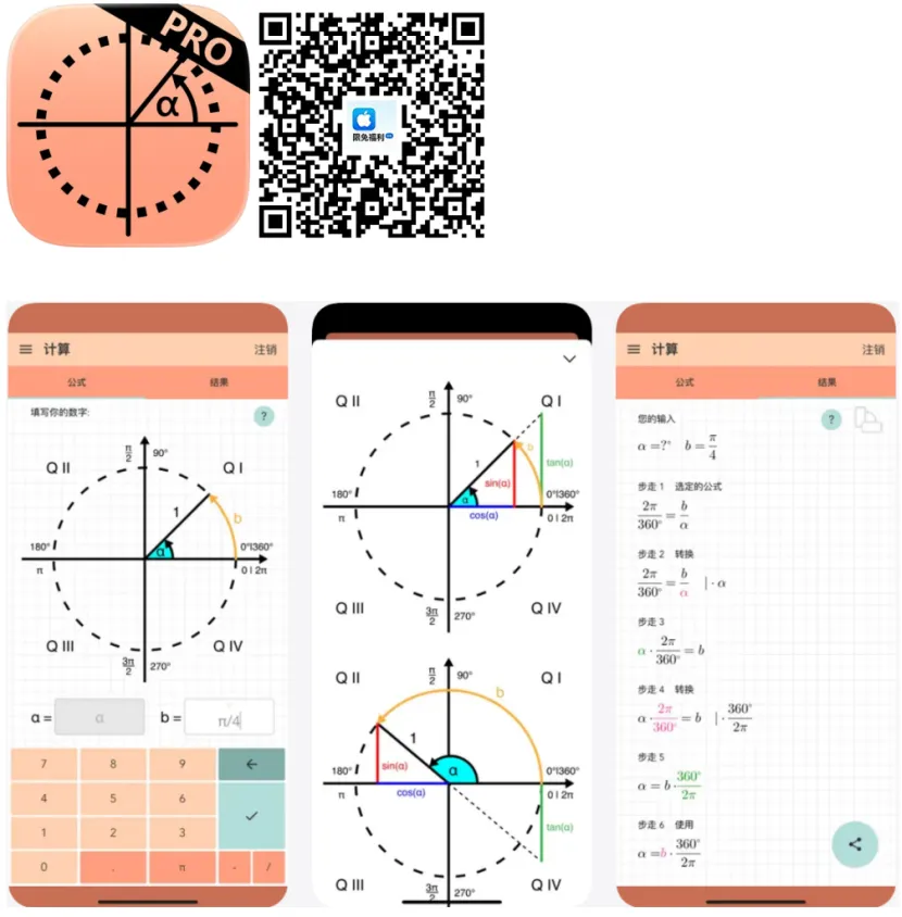 简介:计算单位圆的所有数量的最好的应用程序。支持负值、小数、分数和π。计算结果会一步步显示出来。所有的计算结果都保存在历史记录中。解决方案可以被分享。