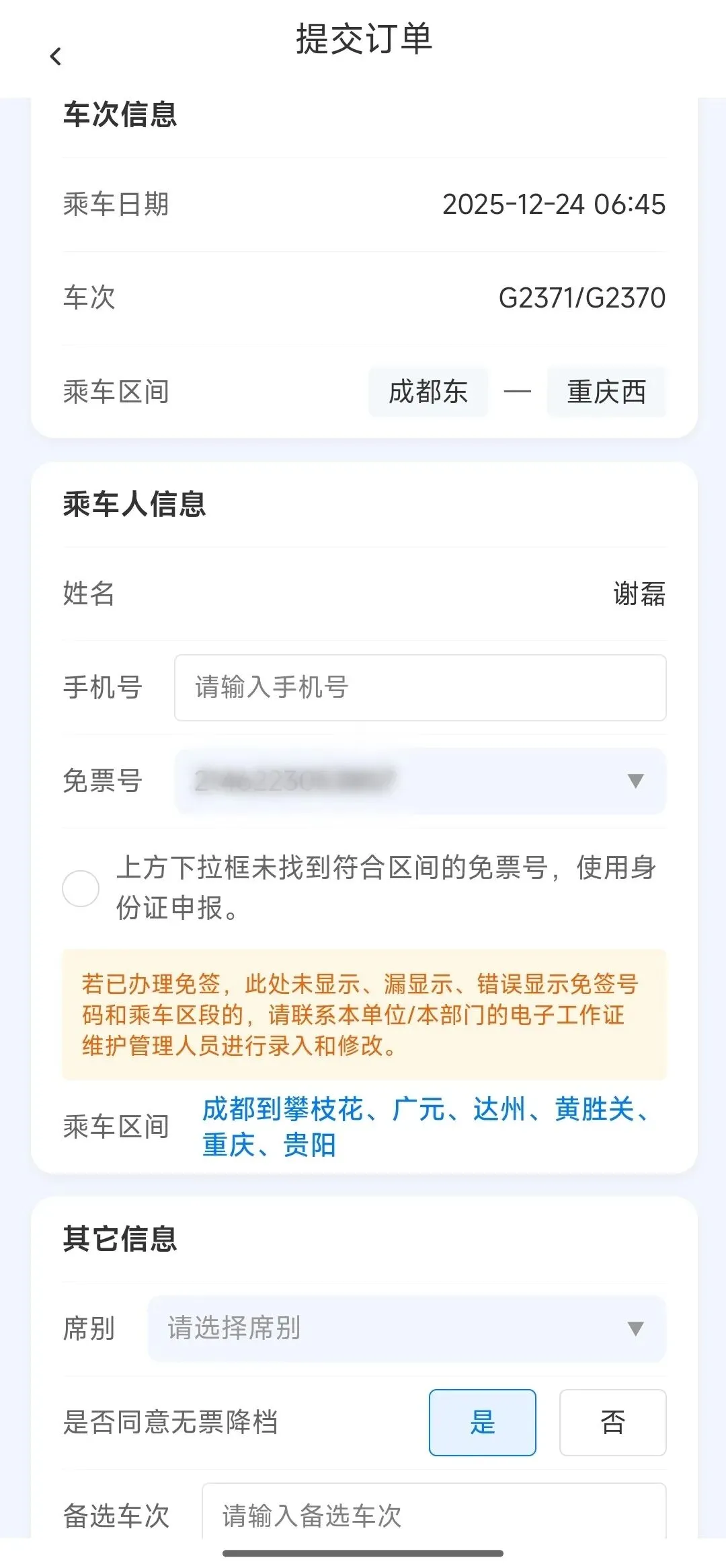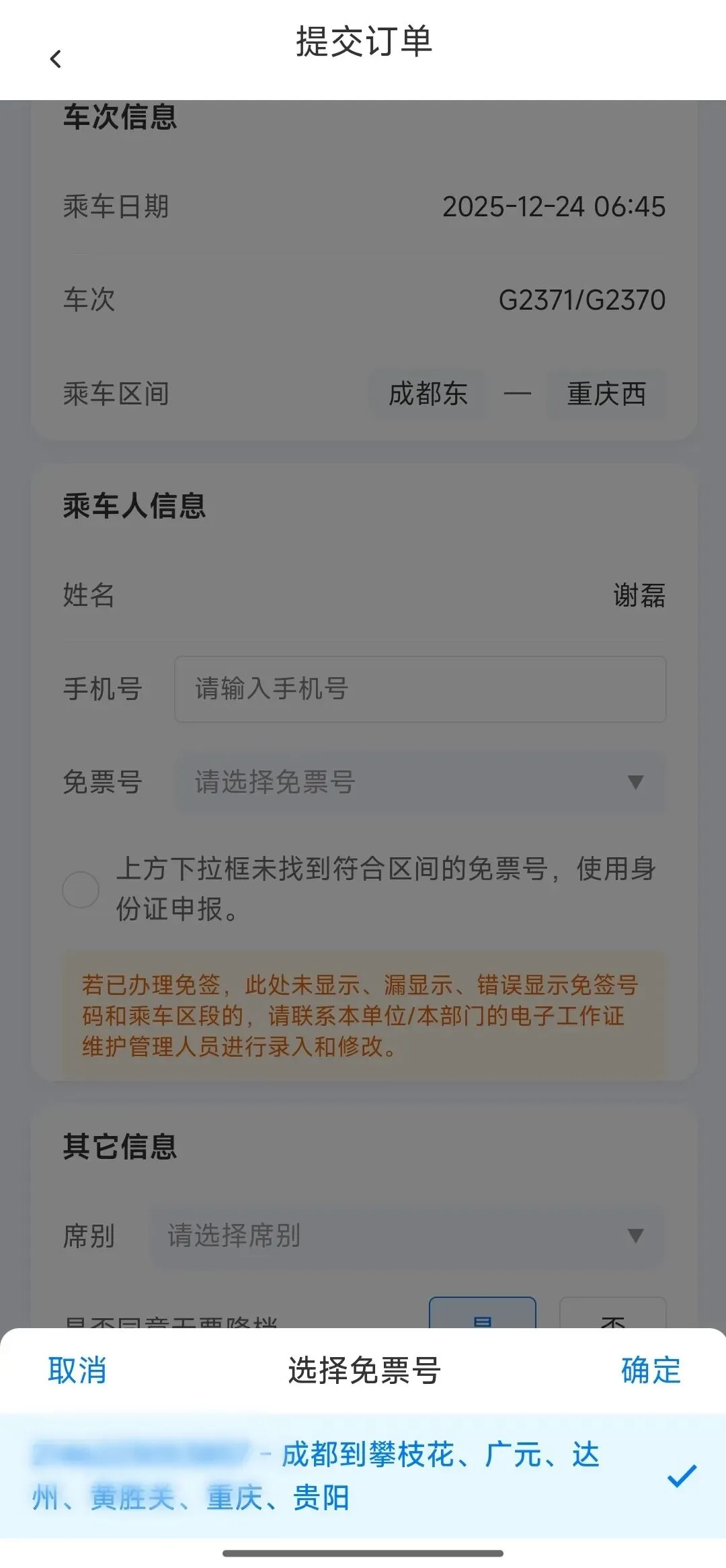 新的出差签票模块,除保留身份证签票同时,增加乘车证号码签票渠道,系统一键勾选个人免票号。