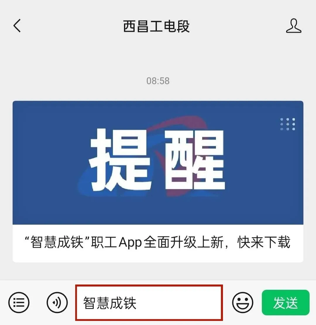 向西昌工电段、成铁微家园微信公众号发送文字“智慧成铁”,公众号自动回复新App的下载二维码链接。