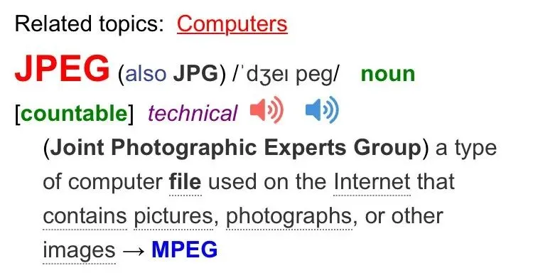 举个例子,JPEG的全称是Joint Photographic Experts Group,很多人会把它读成J-P-E-G,但其实它是一个“首字母拼音词”。它应该读成/ˈdʒeɪ peɡ/