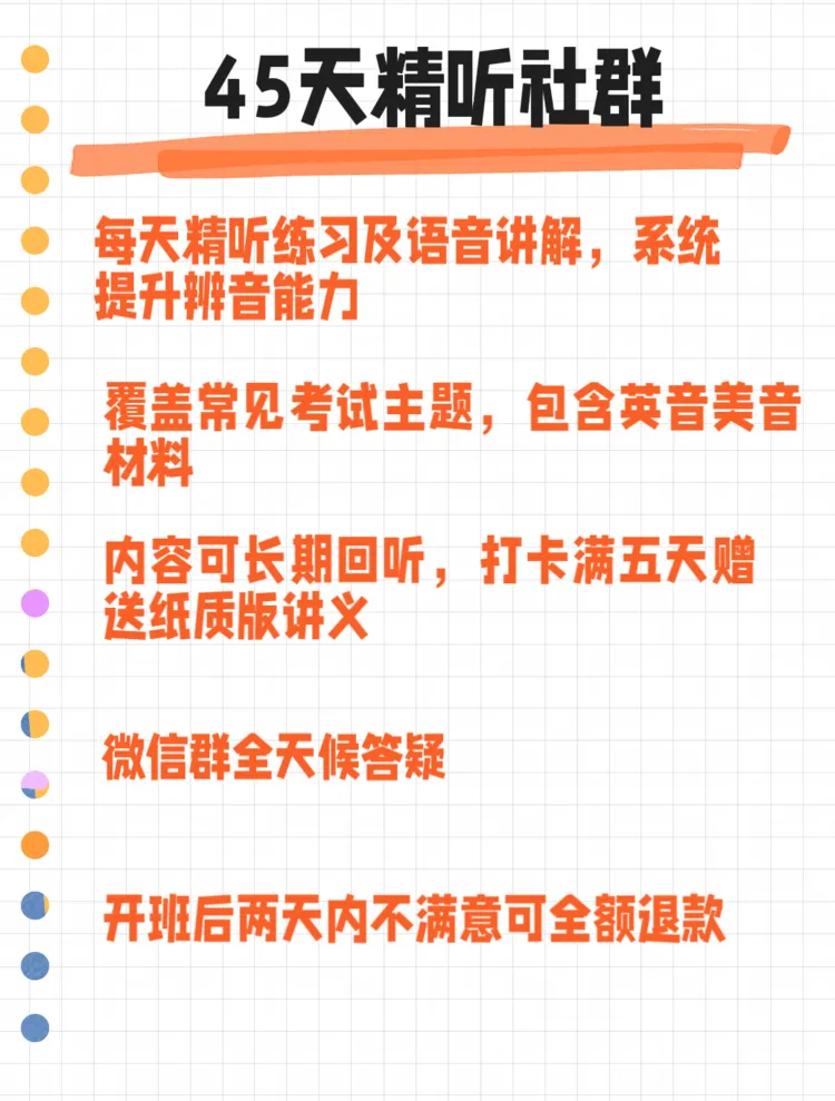 新一期的“45天精听社群”即将开班。在社群里面我们将会进行精听+泛听练习,重点训练辨音能力,攻克连读弱读等语音难点,解决“单词都认识但听不出”的问题。
