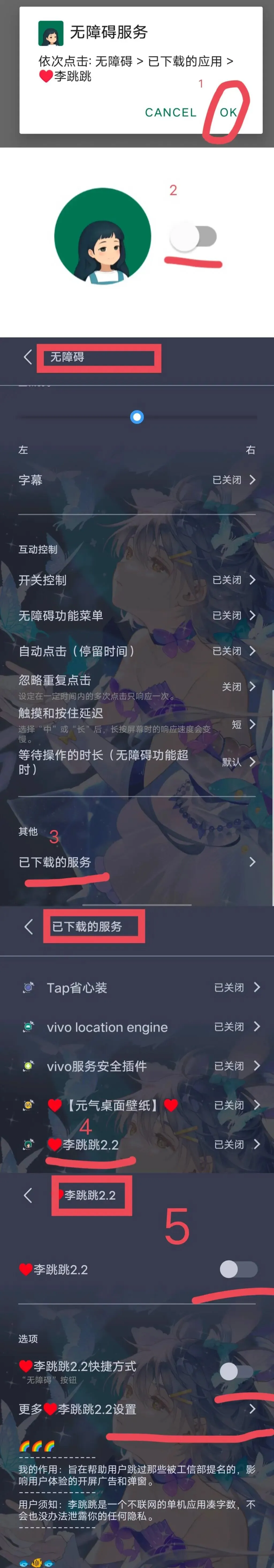 2.2.1 打开软件>知道了>点击中间的按钮>选择ok>跳转到系统相关界面>滑动界面找到“已下载的服务”>找到“李跳跳”>把两个按钮都打开,并且点击一下“更多设置”