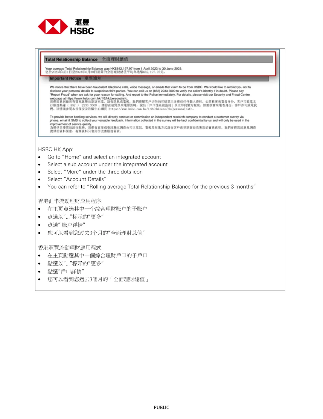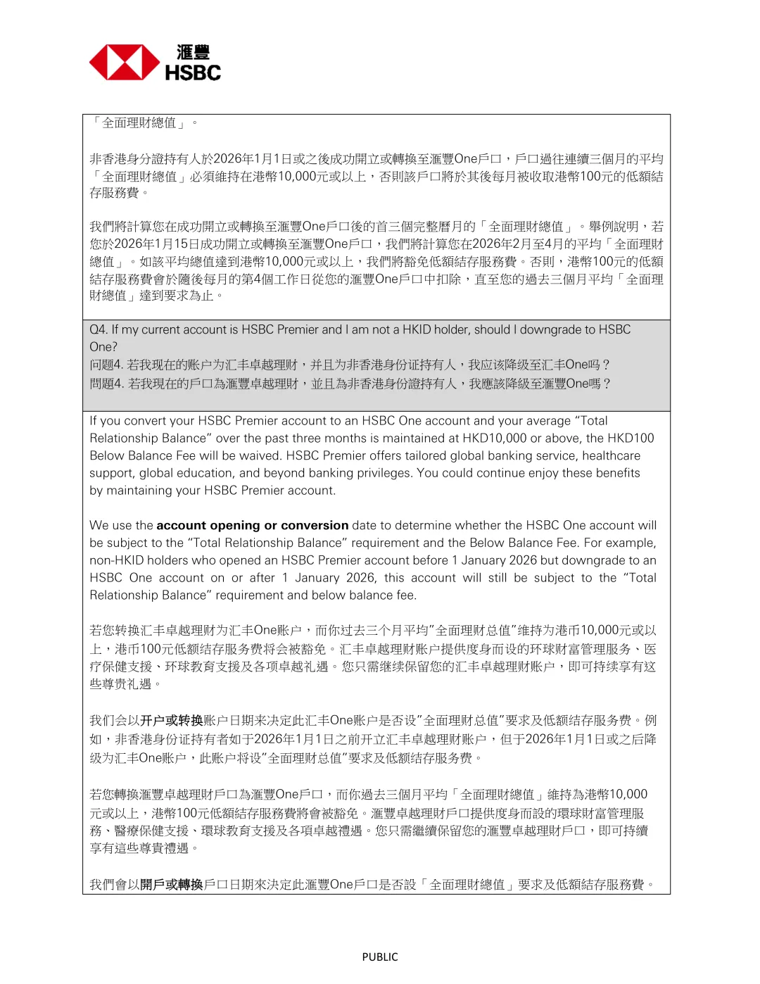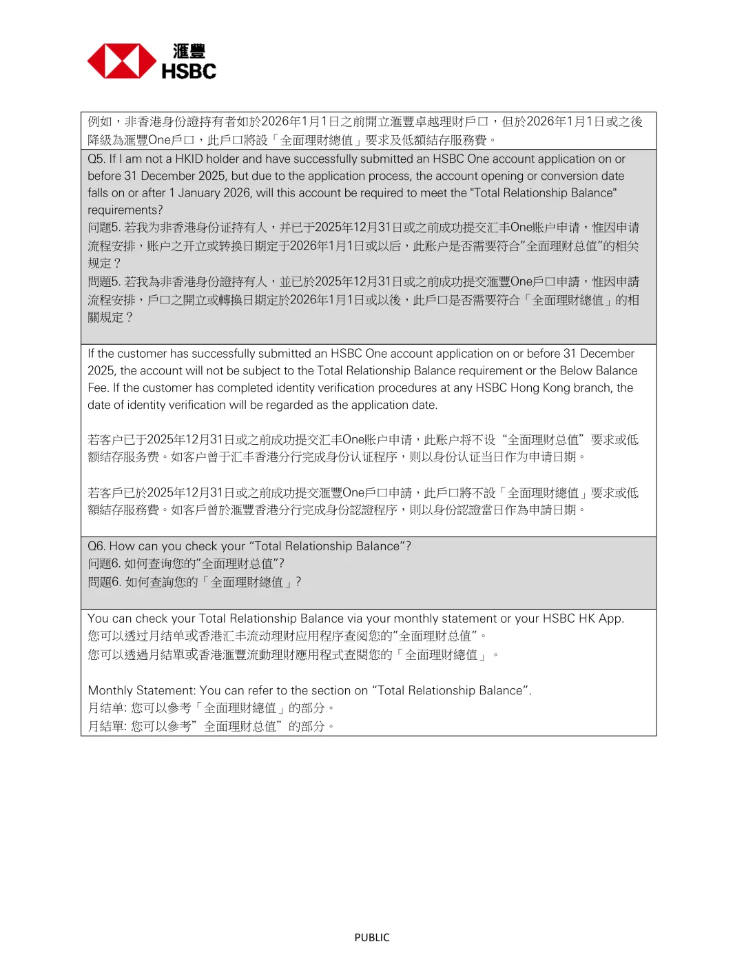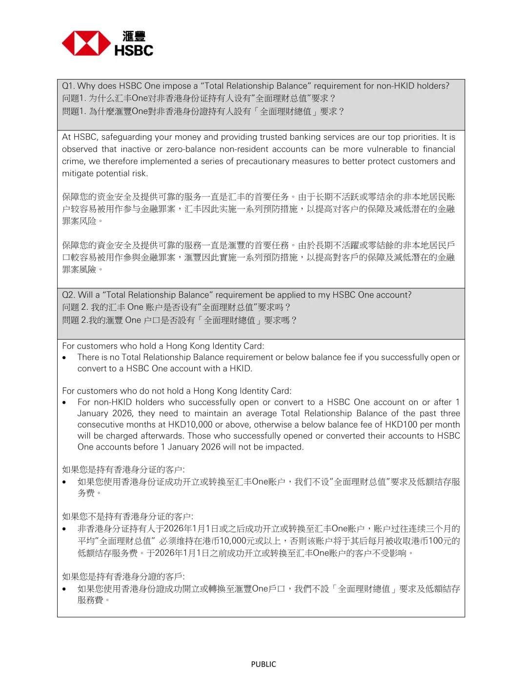 于2026年1月1日前开立汇丰 One账户的非香港身份证持有人,或使用香港身份证开立账户的客户,则不设“全面理财总值”要求及低额结存服务费。查阅常见问题(PDF):