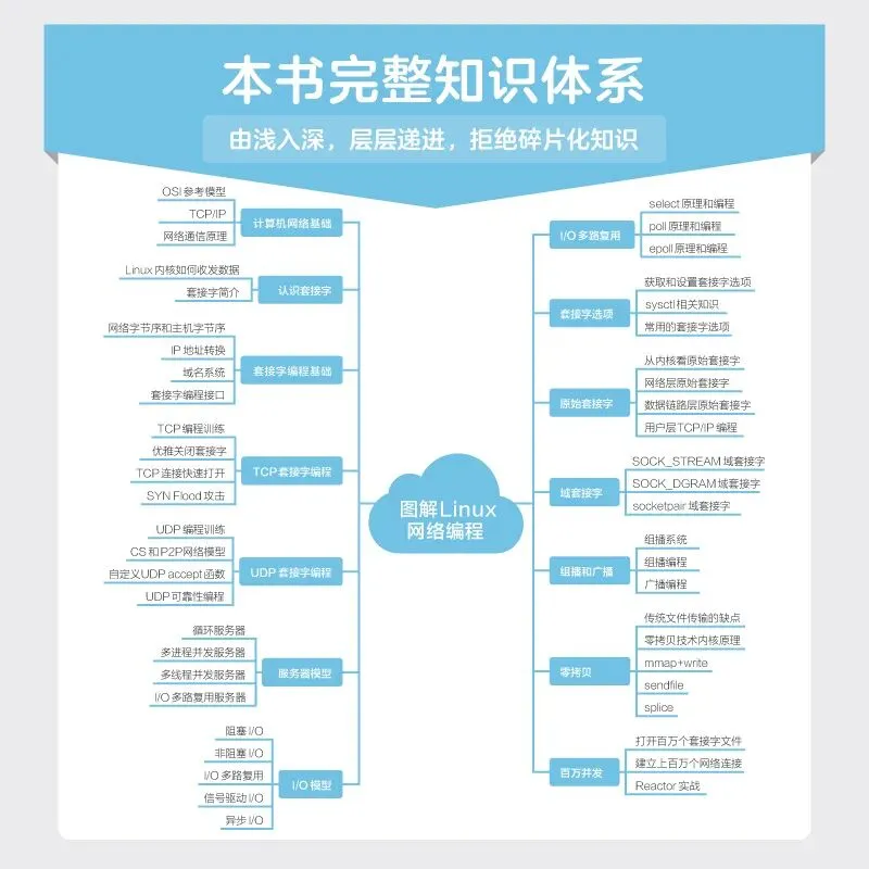 高级篇:原始套接字、域套接字、组播广播、零拷贝、百万并发从入门到进阶全覆盖,帮你摆脱碎片化学习,建立系统的网络编程知识框架。