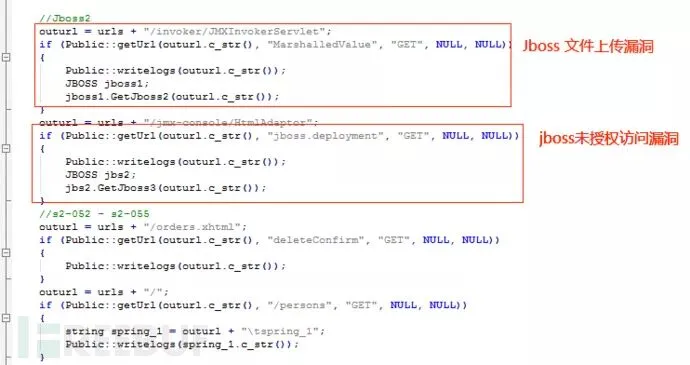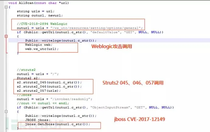 以上诸如struts2.cpp、tomcat.cpp、weblogic.cpp、jboss.cpp中的攻击代码,均在AllScan中调用: