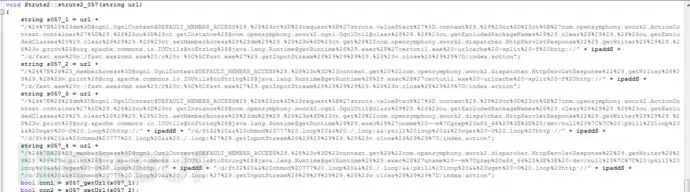struts2.cpp:包括045、046、057的攻击payload,满足条件时,调用public的上传模块,将攻击成功的目标站点通过自定义base64编码上传到黑客站点。