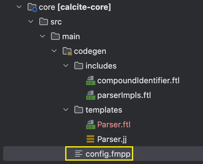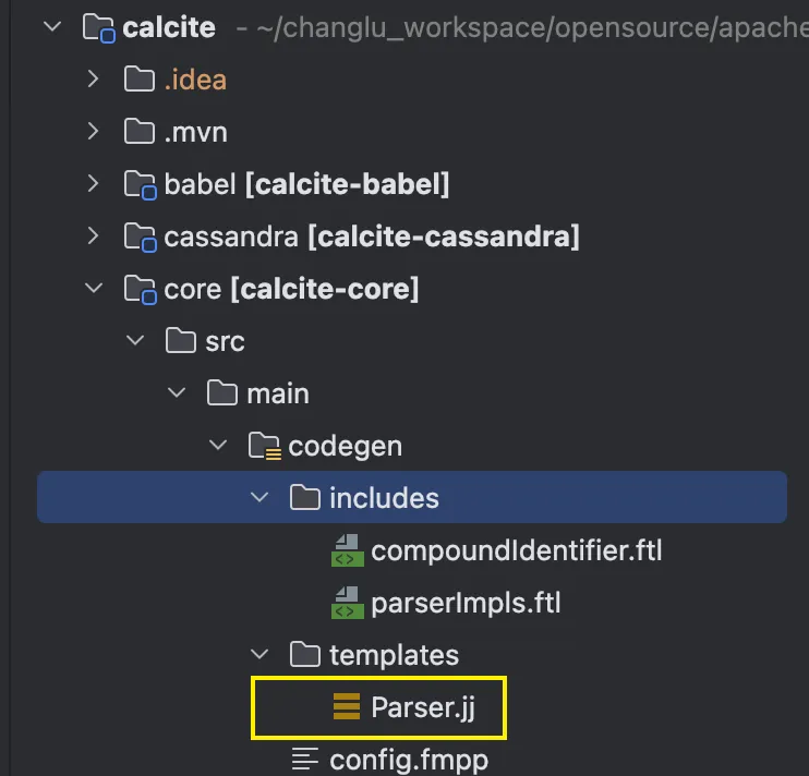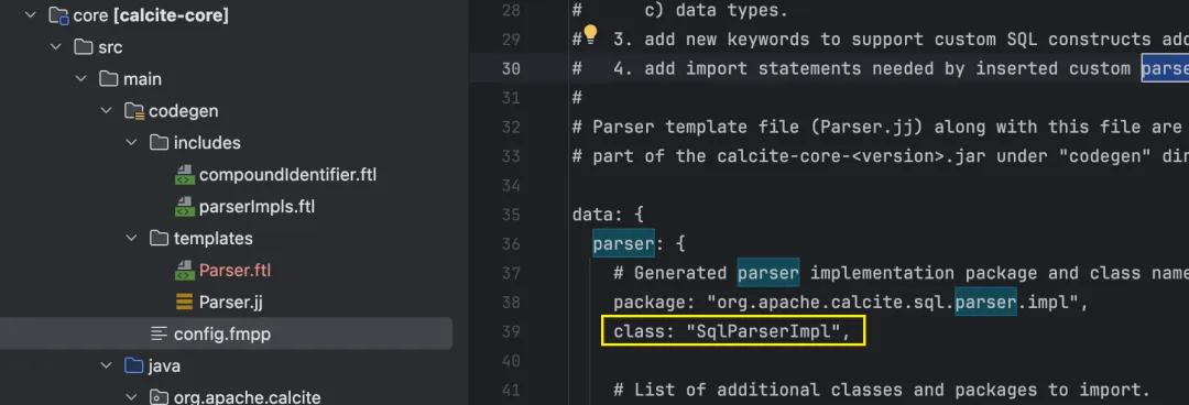 calcite基于javacc扩展的解析SQL的实现在core包中: