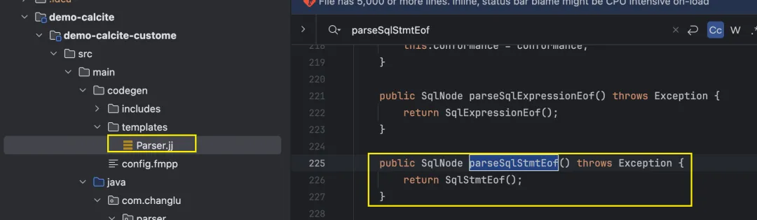 public SqlNode parseQuery(String sql) throws SqlParseException { this.parser.ReInit(new StringReader(sql)); //1 return this.parseQuery();}public SqlNode parseQuery() throws SqlParseException { try { //2、自定义parseSqlStmtEof return this.parser.parseSqlStmtEof(); } catch (Throwable var2) { Throwable ex = var2; throw this.handleException(ex); }}