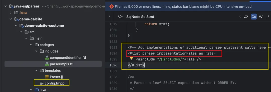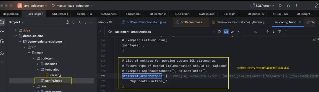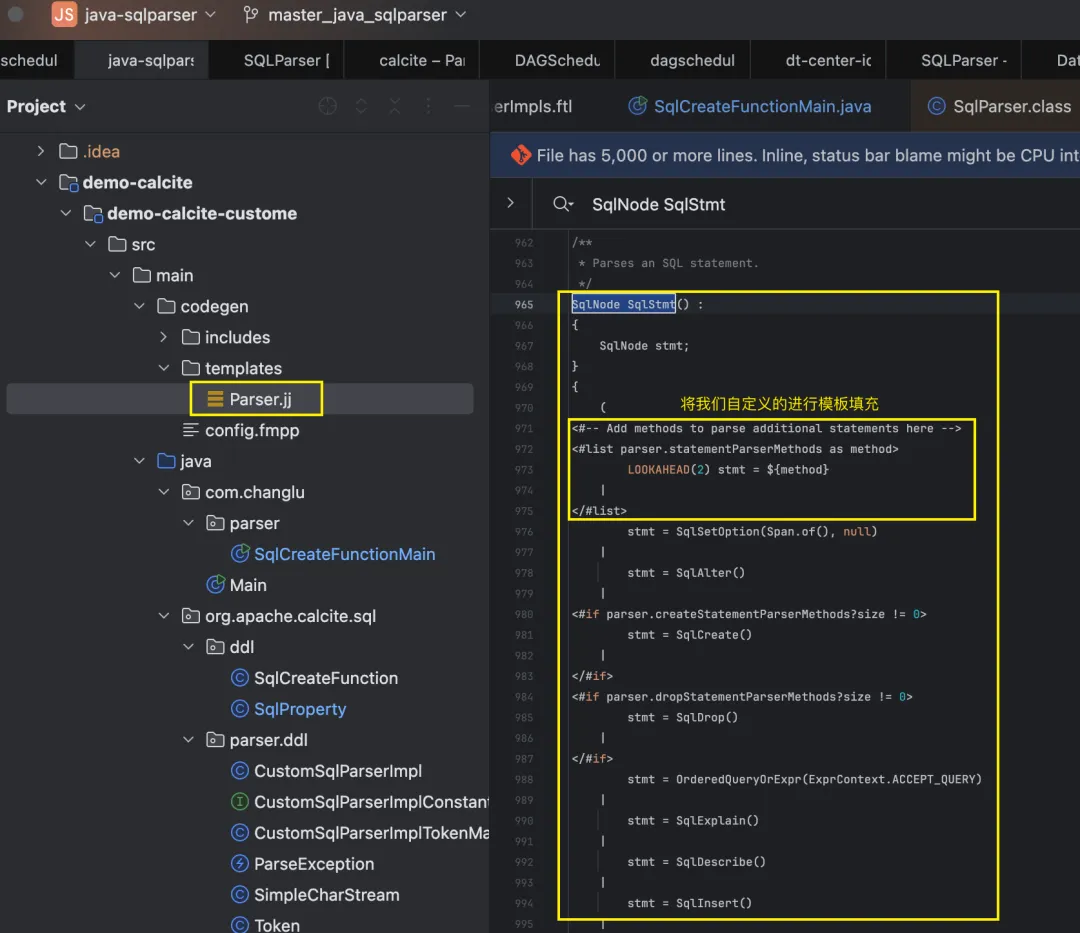 calcite是使用javcc+FreeMarker集成的,借助FreeMarker支持用户自定义自己的语义、语法分析及处理,扩展性极强。