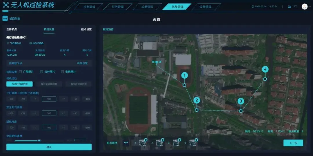 支持自定义巡检航线、任务周期,无人机按预设路径自动巡航,无需人工操控; -