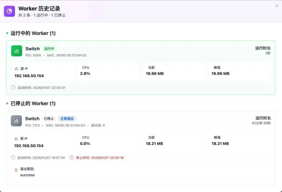 进入插件管理界面,找到Worker进程统计,点击「展开」即可看到实时状态面板。在设备列表中选择特定设备,点击统计icon,即可查看详细历史记录与退出日志。