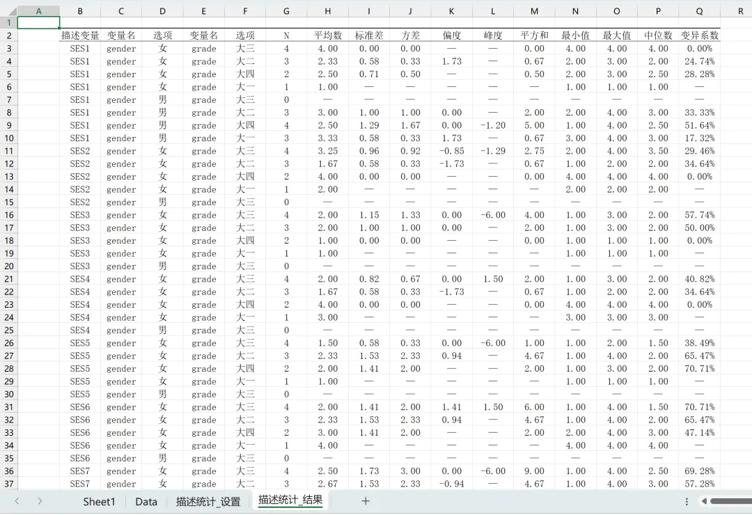 按照例一的流程,在设置工作表中,C2单元格增加分组变量【gender】,D2单元格增加分组变量【grade】,则可实现分级展开进行描述统计。
