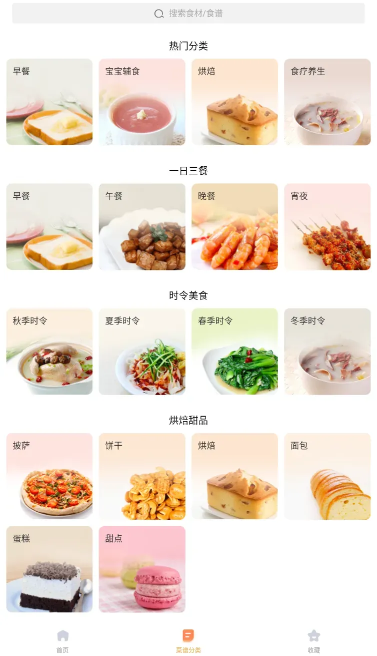 更贴心的是,软件自带 **【菜谱分类】专区 **,烘焙甜品、主食小吃、美容养生、婴幼辅食等品类全覆盖,每个分类下都有详细的菜谱和步骤教程,就算是厨房新手也能轻松上手~