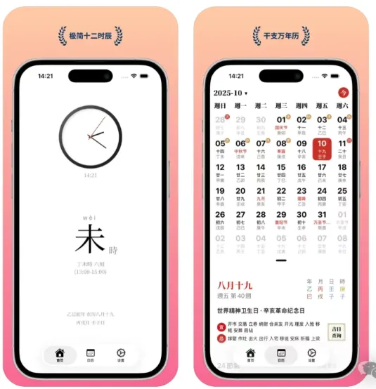 一款日历软件,可以高颜值展示十二时辰,内置了提供3中不同尺寸的桌面小组件,使用软件设备需装有 iOS 17 或更高版本。