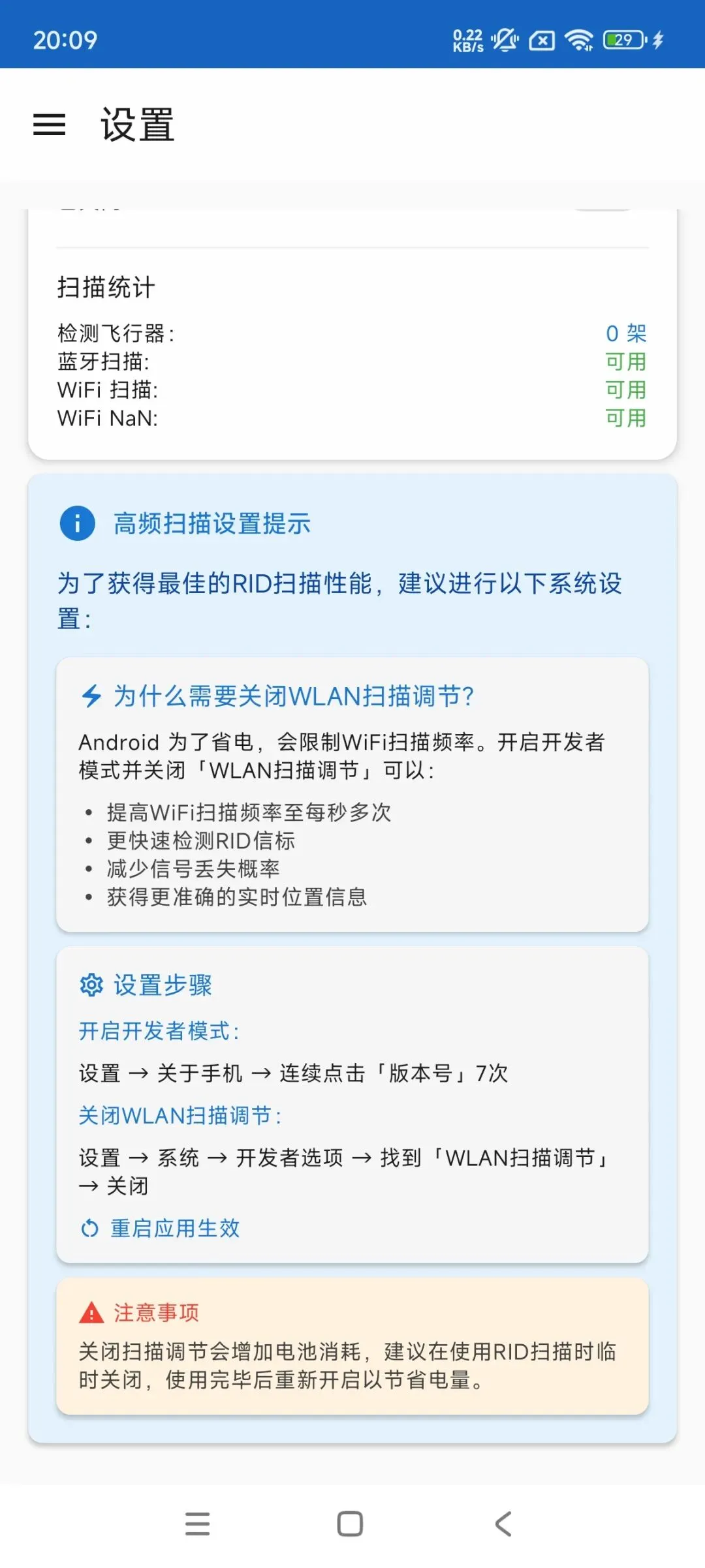 本应用【Rid检测器】是一款免费软件(测试版),旨在为用户提供【扫描附近无人机功能】。开发者不对服务的持续性、稳定性或完整性作出任何承诺。本应用功能完全遵循国标remote id的设计初衷,若个别用户利用定位功能做出违反道德和法律的一切行为,与开发者和发布者无关。
