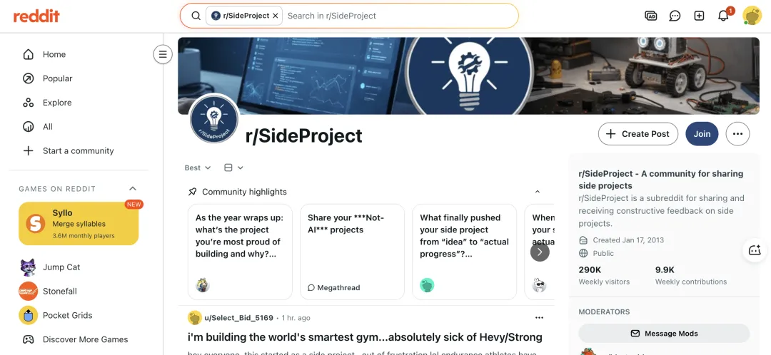 比如r/SideProject这个社区,有超过四万三千名成员,都是对副业项目感兴趣的人。r/SaaS有三十万成员,都是SaaS产品的潜在用户。甚至r/Programming这样的大社区,有六百八十万成员。这些都是你可以在今天就去发帖分享产品的地方。