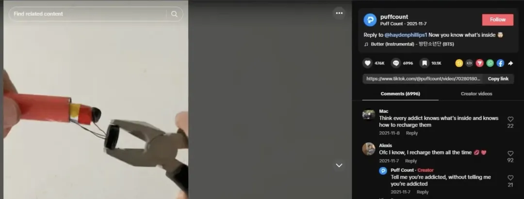让他给你看个例子。他做过一款叫Puff Count的戒电子烟应用,有个视频获得了四十七万六千个赞。在那个视频里,他只用了两秒钟提到产品。整个视频的主要内容是什么呢?他拆解了一个电子烟,展示里面的结构——彩色的金属外壳、电池、浸满化学液体的棉花。他说:”真疯狂,人们居然在不知道里面是什么的情况下就抽这些东西。”