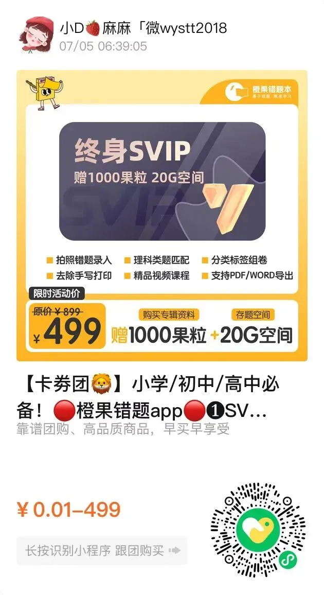 团|橙果错题本APP,开学大促来了,终身SVIP才499元,2.6折骨折价!
