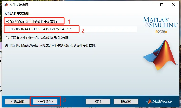 第七步:选择【我已有我的许可证的文件安装密钥】,输入安装密钥【09806-07443-53955-64350-21751-41297】,点击【下一步】。