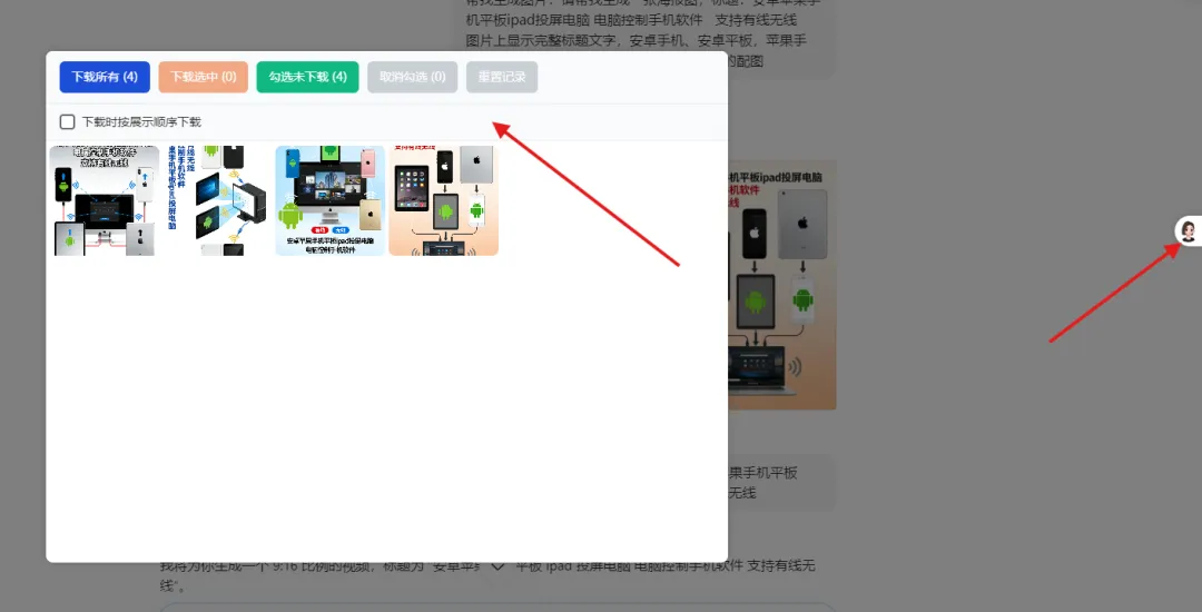 插件安装完毕,下一步用豆包生成了几张图,点击右边浮动的豆包ai批量下载的头像,弹出单独下载和批量下载的选择框,即可根据自己需求下载无水印图片,如图: