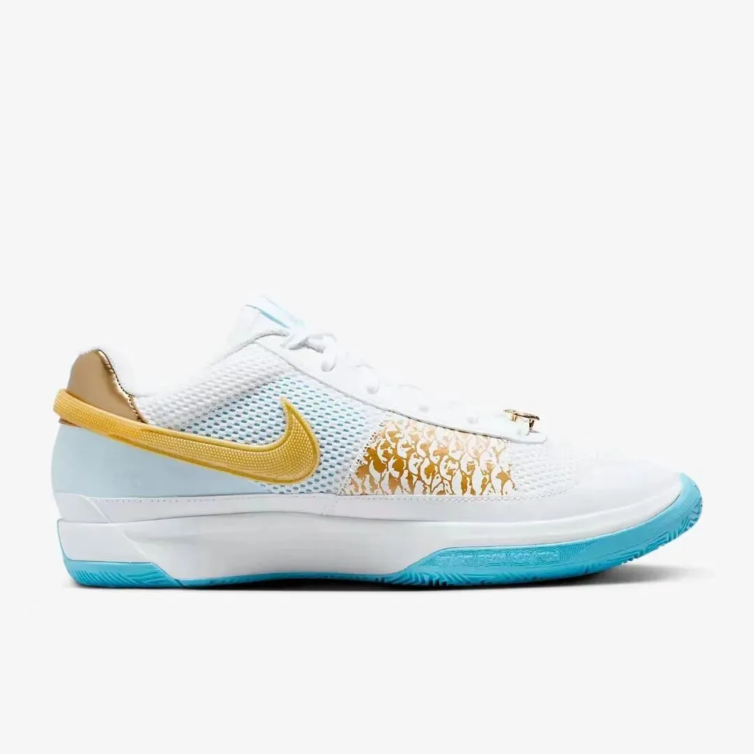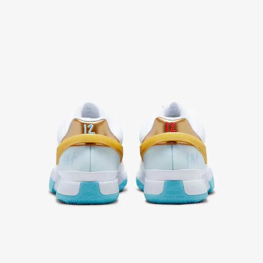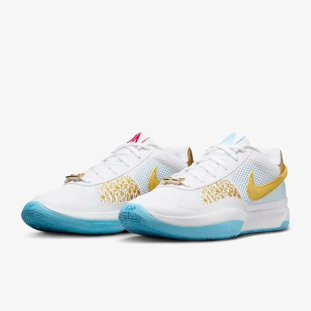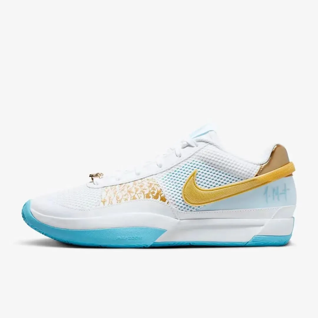 鞋款以中国喜庆红色色调为主色调,延续经典爪痕设计,辅以黑色的涂鸦风格“A”字(代表“Ja”),鞋侧金色 Swoosh 与黑色锯齿状 Zoom 外底形成强烈视觉冲击。其他细节包括仿马毛鞋舌和鞋垫上有中国书法“一马当先”字样,以后跟外底刻有“Twelve”字样,致敬莫兰特的 12 号球衣,最后以红色橡胶外底完善鞋身,庆贺马年到来。